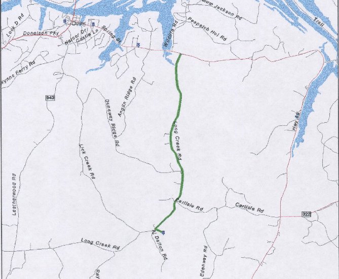 From Dover take Hwy 49 toward Tn Ridge. Drive 2 1/2 miles and there will be a road to your right, this is Long Creek Rd (you will see the VFW up on the hillside from the intersection). Drive about 4 1/2 miles and there will be a road to the left. Take this and cemetery is down at the end. ***note*** This road will be the second road to your left, after you pass the road going to Carlisle there will be a white church building to your left. If you get to the gravel road going to Sweetheart Springs on your right you have gone too far.