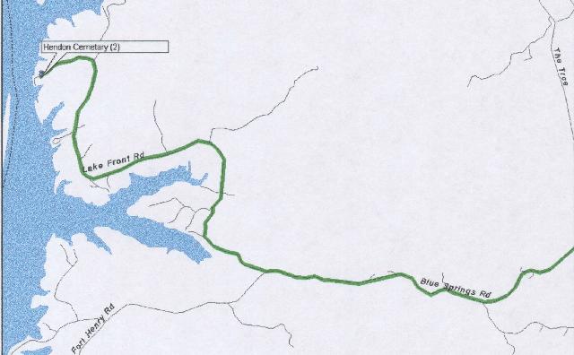 Hendon Cemetary: From Dover, Turn onto Hwy 49(The Trace), drive 3 1/2 miles and the South Information Stand will be on your right. Just after you pass this, there will be a road going to your left. Take this, it will be Blue Springs Road. Drive about 4 miles, you will start around a curve, and there will be a road leading to the right (looks like a fork in the road) take this right. This is called Lake Front Road, but it is the road going to Blue Springs. Drive about 4 1/2 miles. There will be a road on your left. Take this left and the cemetary will be around 3/4 of a mile down the road at a fork. From Model, drive to the South Information Stand Blue Springs Road will be to your right, from there follow the above directions.