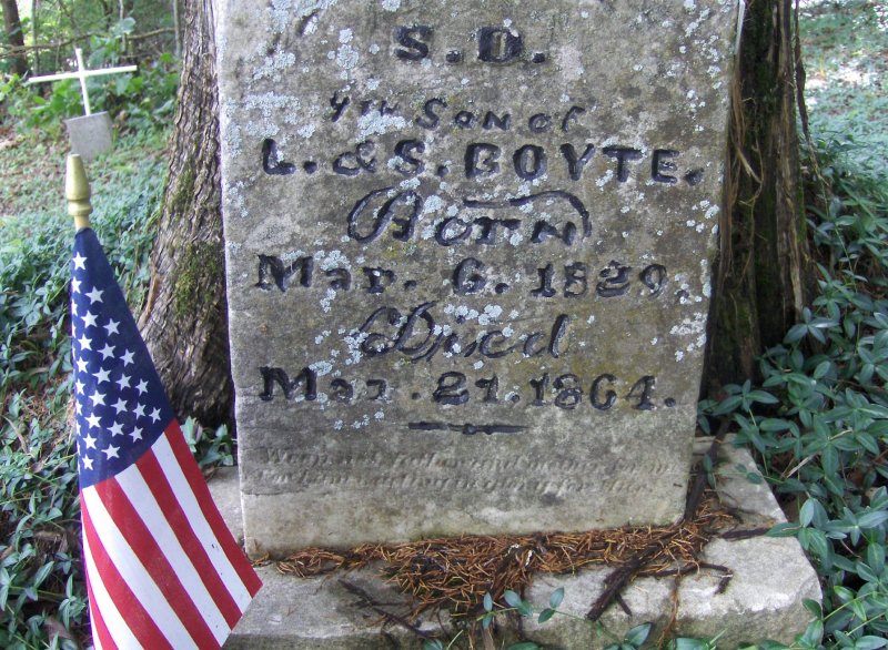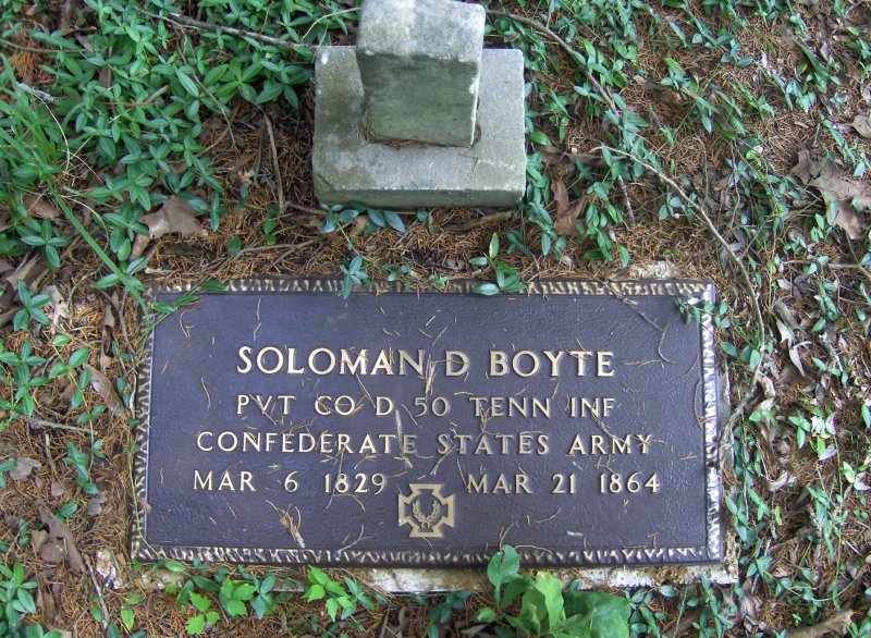 | 10 | BOYTE | ![]() ![]() Soloman Dawson, 06 Mar 1826 - 21 Mar 1864, 4th son of Lemuel E. and Sarah (DAWSON) BOYTE, Pvt., Co. D, 50th TN Infantry, CSA |