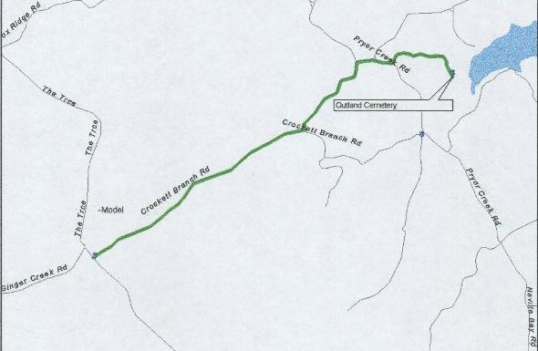 Directions to Outland(from Model): Turn right on Crocketts Creek Rd(just past the furnace), and drive about 3 miles. While you're on Crocketts Creek Rd, there will be 3 roads going to your left. The first is the road going to Priors Creek, the 2nd goes to Linton, and the 3rd is the road you want. Drive to the end, and at this point I must add that it has been years since I was last there. I don't know what condition the road is in, and if I remember right you will have to do a little walking. If it is summer spray for ticks. **note** If memory serves, face the end of the road and walk that direction, the cemetery is down that way and to the left.