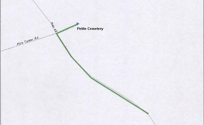 Directions to Petite Cemetery: Drive down The Trace until you get to Petite Ridge(ridge that the fire tower is on). Instead of turning left, if you are coming from Dover, take a right. That road goes right to the cemetery. *** note: The road is not marked on the map, but it is there*** (Just reverse directions if you are coming in from Trigg Co.)