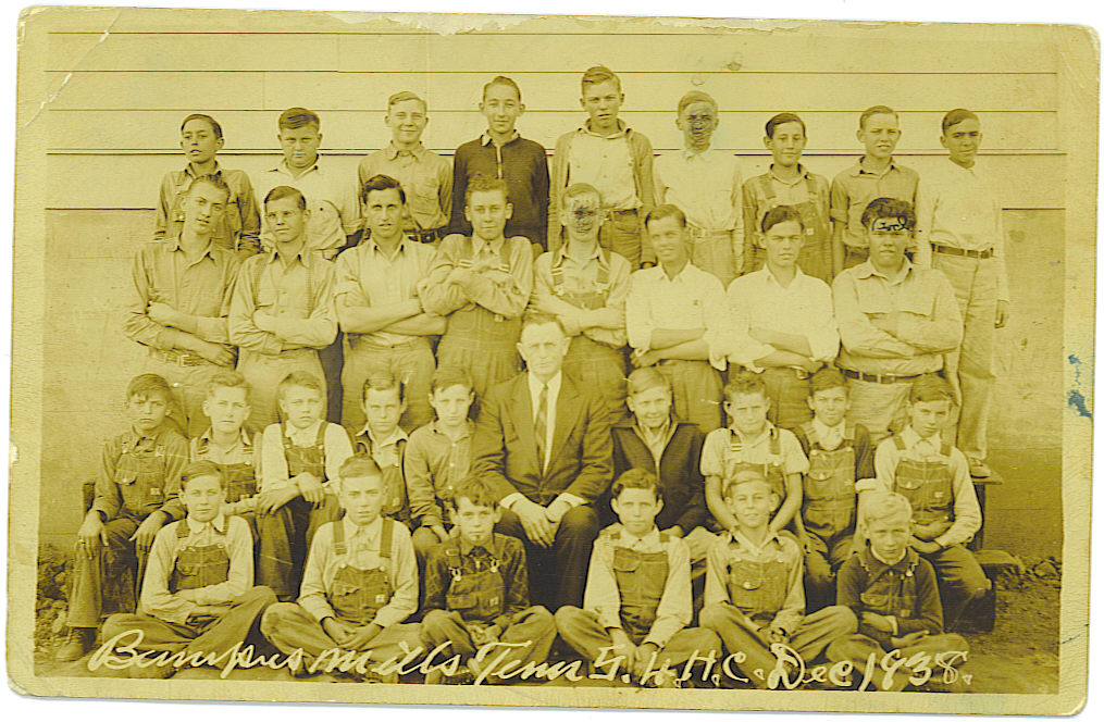 (2nd row, seated): Cecil Mathis, Grady Hardy, Grady Shelton, Cecil Ezell, Comer James, TEACHER Nova Wallace, J.R. Walker, Manuel Ezell, Finis Roberts, Elvin Roberts