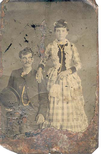 This is an old tin type, believed to be the wedding picture of my great-grandparents, Wallace Roy Cherry born in Stewart County, TN in 1862, and Lucille Overton Gardner born in Trigg Co. KY in 1869. They married in Stewart Co. TN June 25, 1888. Wallace's parents were George Y. Cherry and Amanda Bagwell. Lucy's parents were John Dabney Gardner and Julia Polk Lander. Their daughter Juliet Amanda Cherry was born in Bumpus Mills, TN (my grandmother). Their son Hugh L. Cherry was born in Big Rock TN, where Wallace was an early principal of the school there. Lucille died very young, when my grandmother was about 8 years old. Submitted by R. Kirchoff shane53@concentric.net