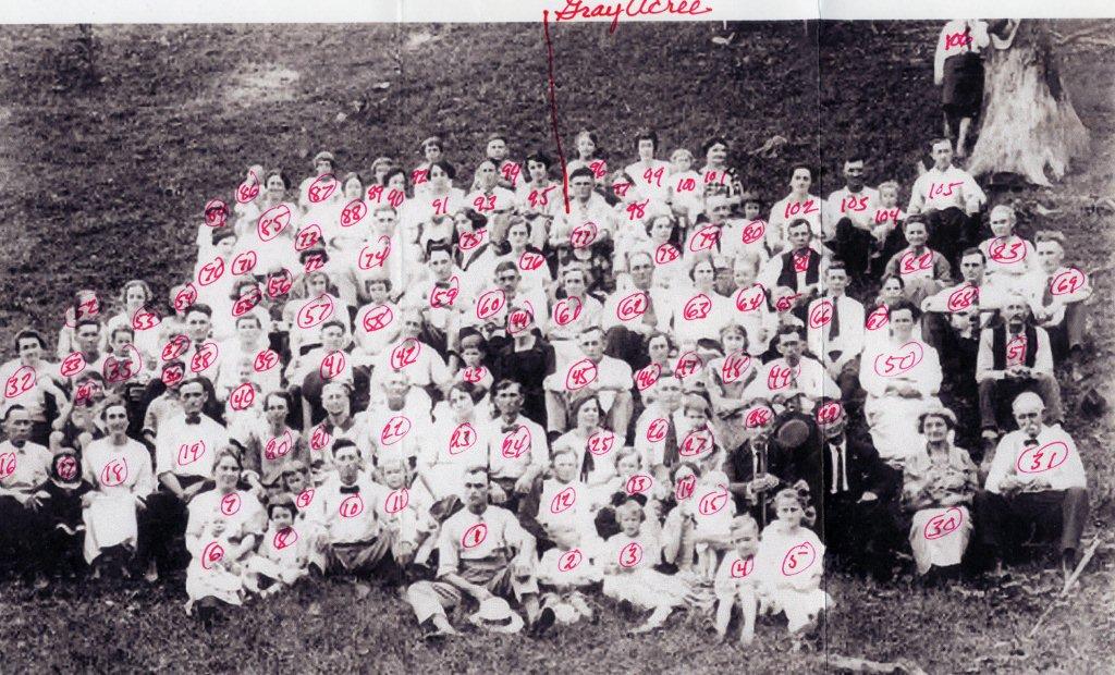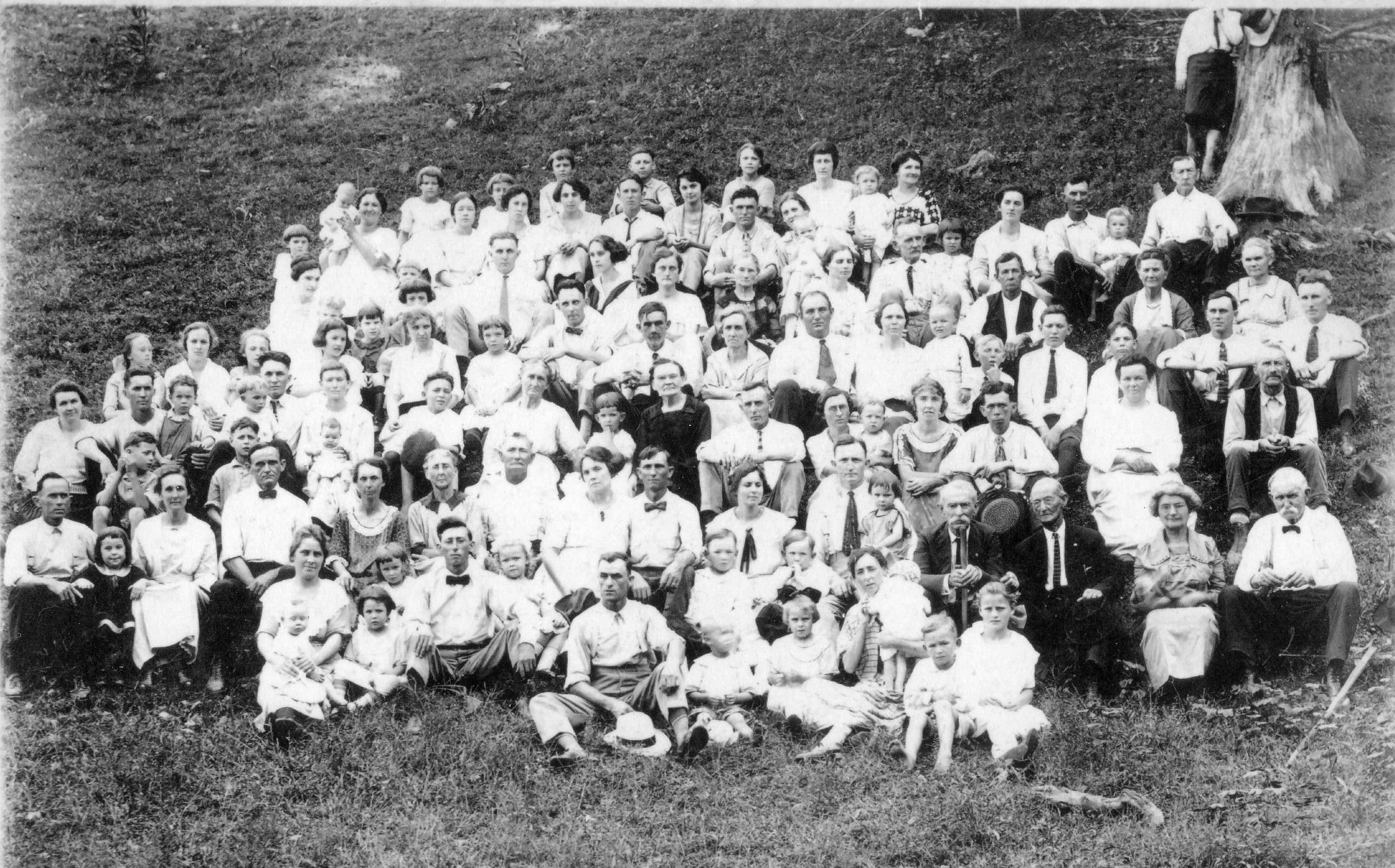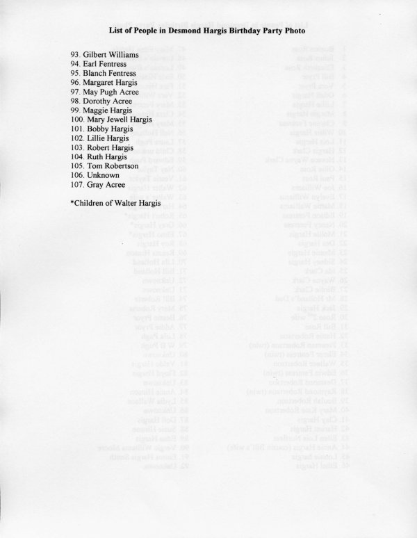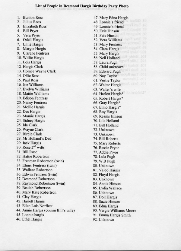 This photo was supposedly taken in 1923 on the occasion of Desmond Hargis' (b. 1856, d.1932) birthday. The second image has each individual numbered, and the last images are photo ID lists so almost everyone in the photo can be identified. The identifications were made by Emma Hargis Smith (she is a daughter of Desmond and is in the photo). Hargis, Hinson, Fentress, Williams and Robertson are some of the surnames found in the photo.
