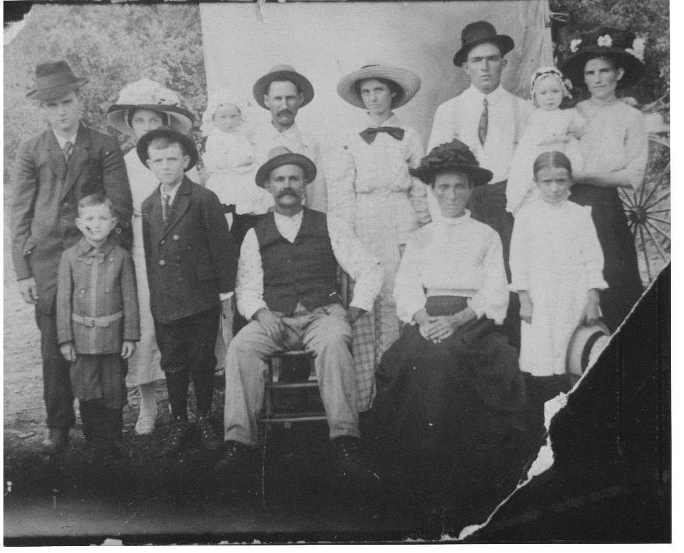 Bottom row (L to R): Buford Phillips (son of Joe & Nannie), Eugene Elesman Kirksey, Thomas Wiley Kirksey, Mary Frances "Fannie" BRYANT Kirksey, Nora Elizabeth Kirksey (my grandmother)