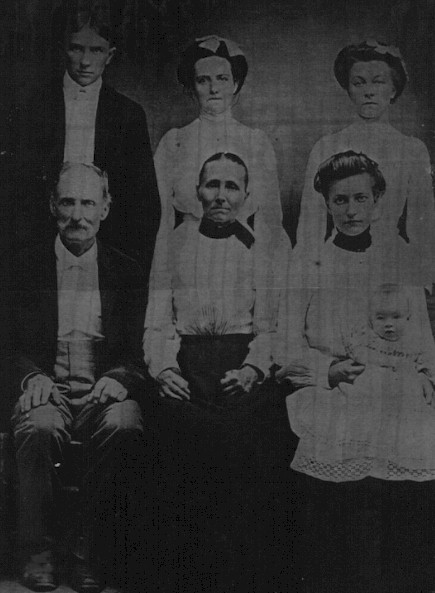 This photo shows on the top row; John Wesley Lancaster, Annie Rougemont, Hattie L. Lancaster. Bottom Row; James Peal Lancaster, Mary Carney, Sarah Margaret Lancaster and on her lap Lois Lucia Taylor. This is the marriage photo of John and Annie, and is dated approximately June 23, 1904. Picture contributed by Debbie Rosenbloom.