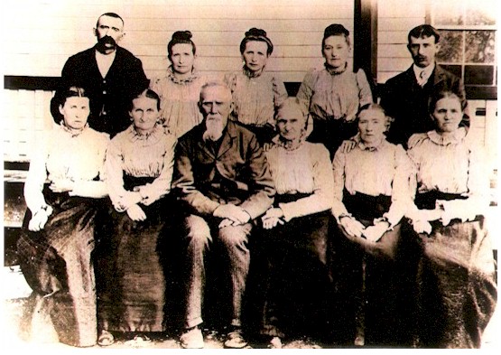 Henry Hicks McGee family. This photo was taken around 1900. Standing L-R is William Eldridge McGee, Lavena, Lavesta, Nevada and Thomas. Seated L- R is Margaret, Rebecca Ann, Henry Hicks McGee, Delilah (Vickers) McGee, Mary Caroline and Emma. Submitted by: Tom McHood; Little River, SC