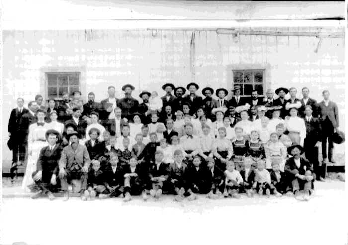 This photo is provided by Stewart Co. Genealogy List subscriber Duane Hargis. He believes it to be the Church of Christ on Saline Creek in Bumpus Mills, however it could be the Primitive Baptist Church. He hopes someone can identify it "for sure". The photo was taken in 1906. His grandfather, James Morris Hargis, is the short man with a hat holding an infant (his father Grady Edward Hargis) in the back row.