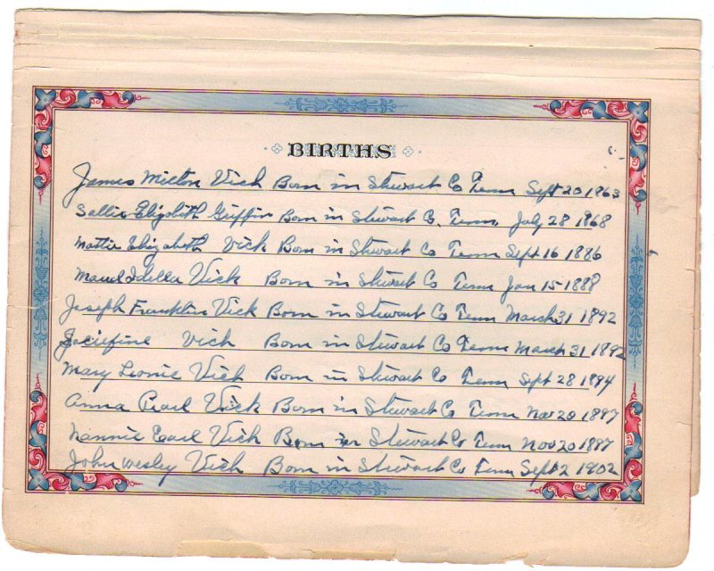 James Milton Vick and Sarah (Sallie) Elizabeth Griffin. Born Stewart County, Bumpus Mills, TN., Buried, Eastside Cemetery, Martin, Weakley County, TN