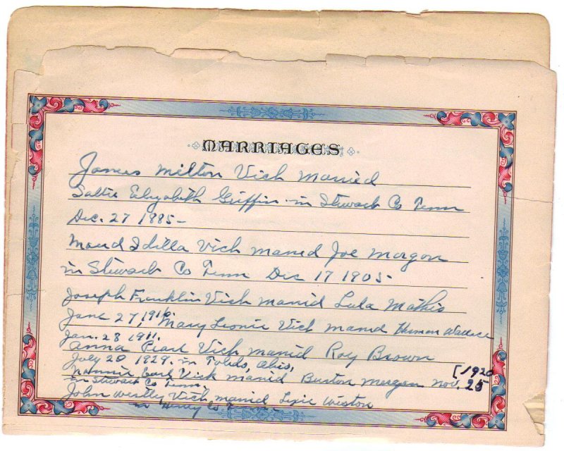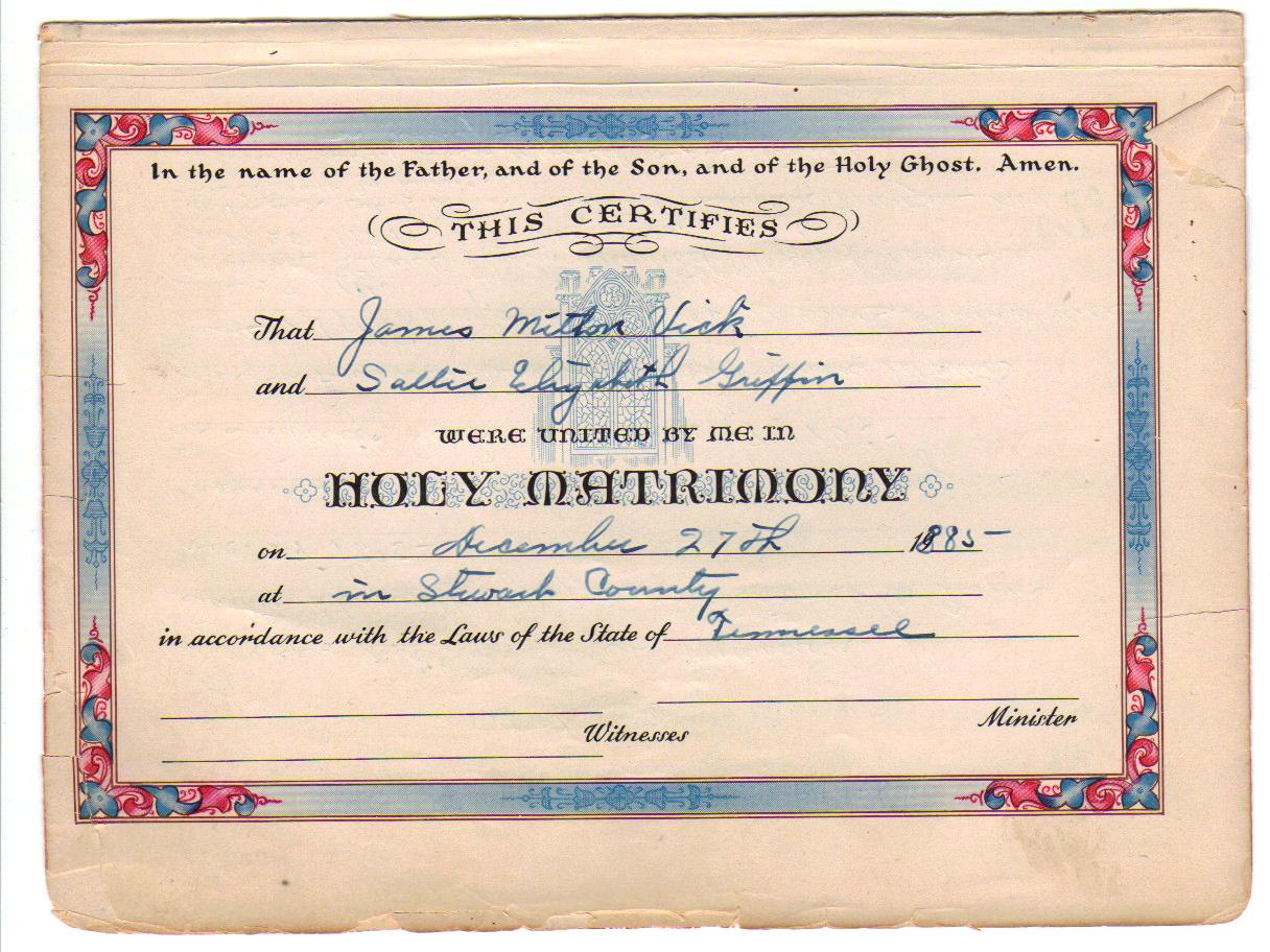 Sarah (Sallie) Griffin Vick & James Milton Vick Marriage Certificate.