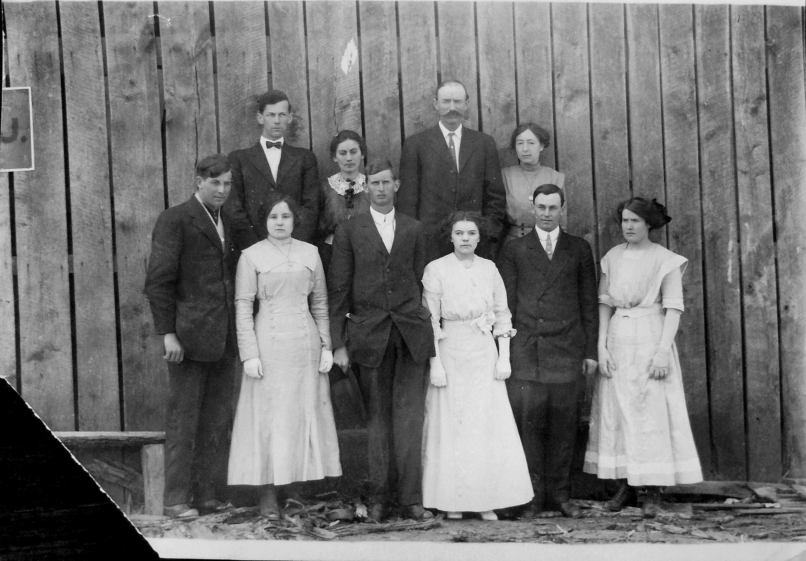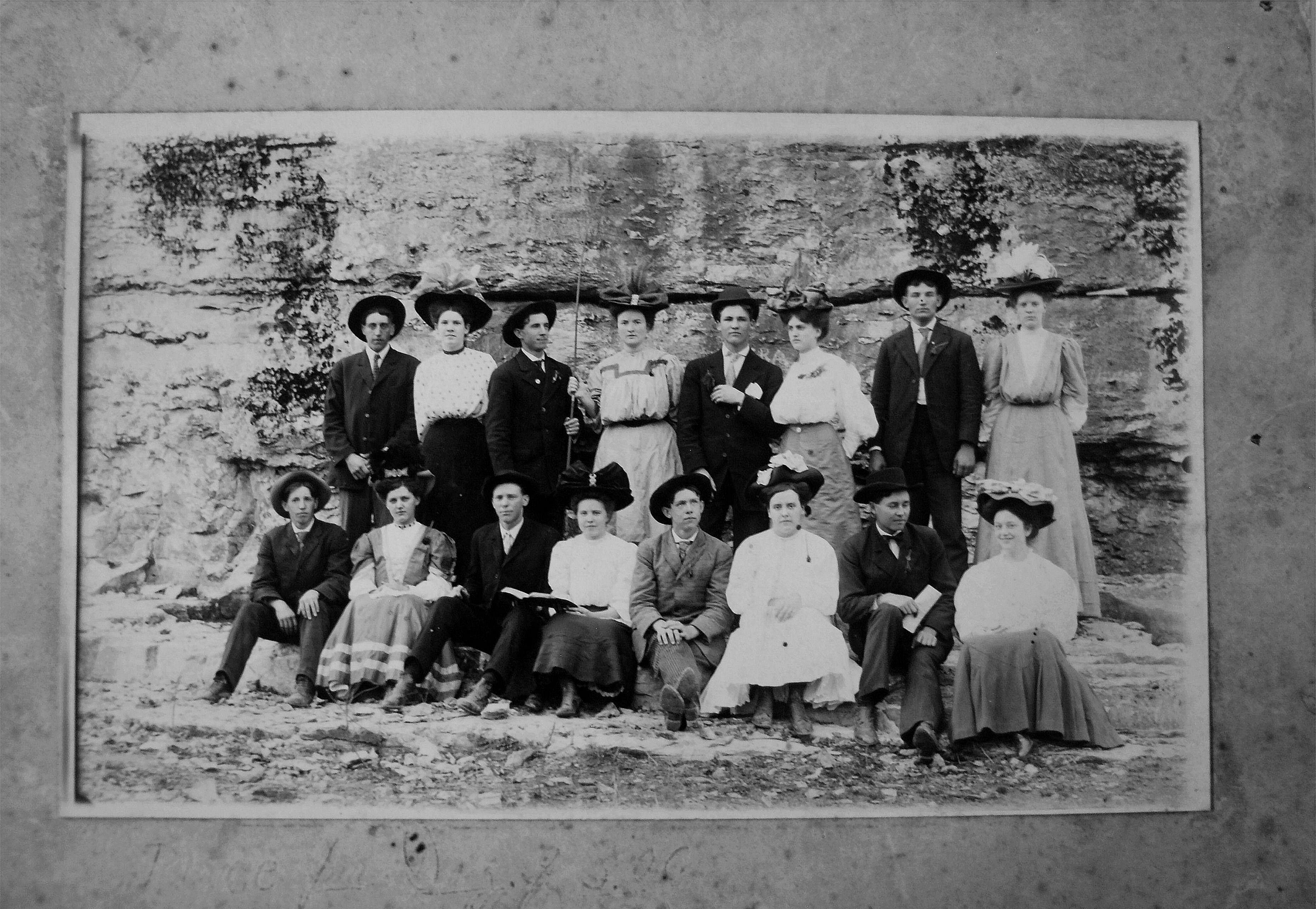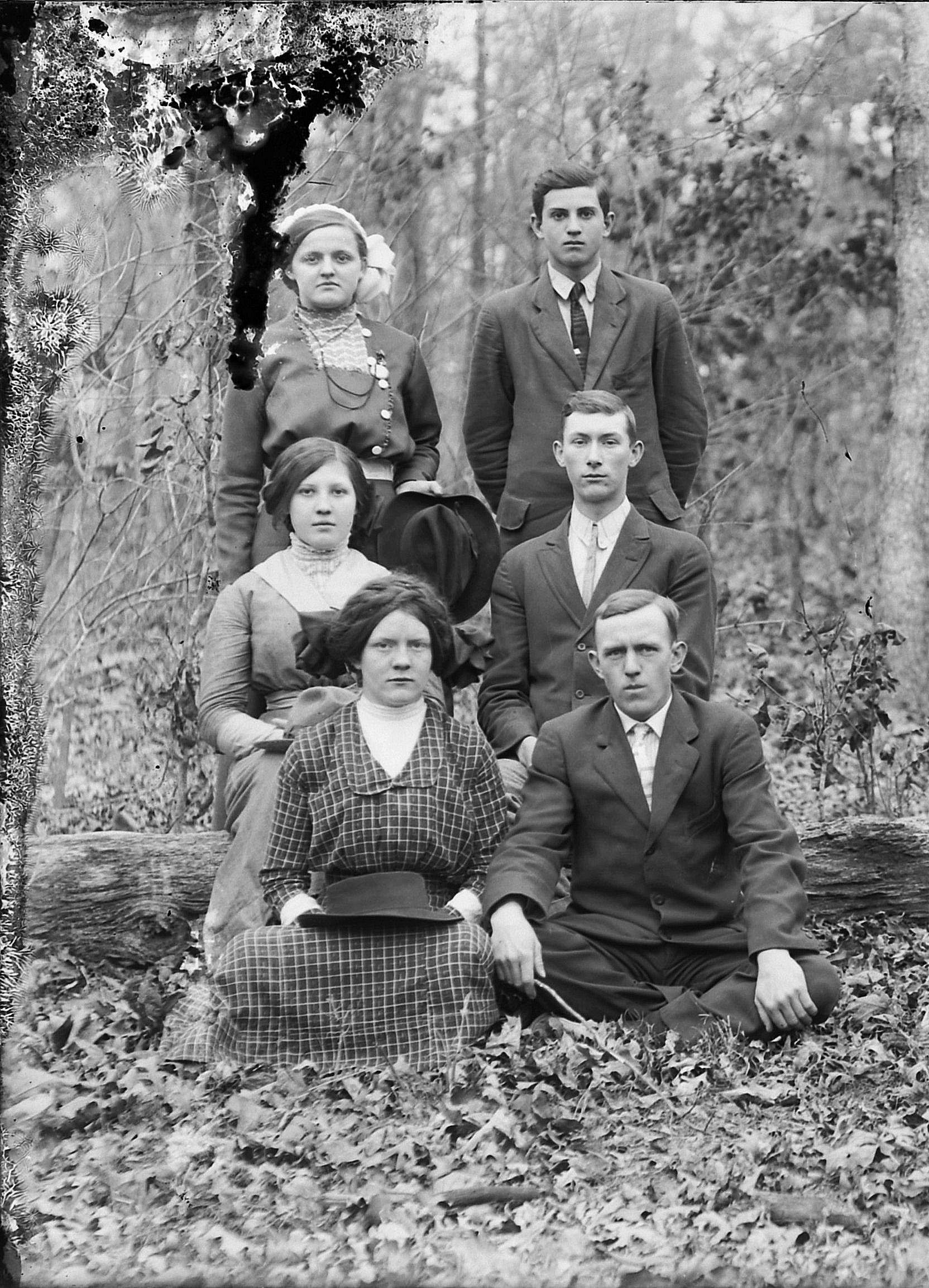 Front row: Sam Wall, Annie Wilson, Charlie Smith, unknown, ____ Pruitt, Madie Smith, Burley Bibb, Pearl Cobb