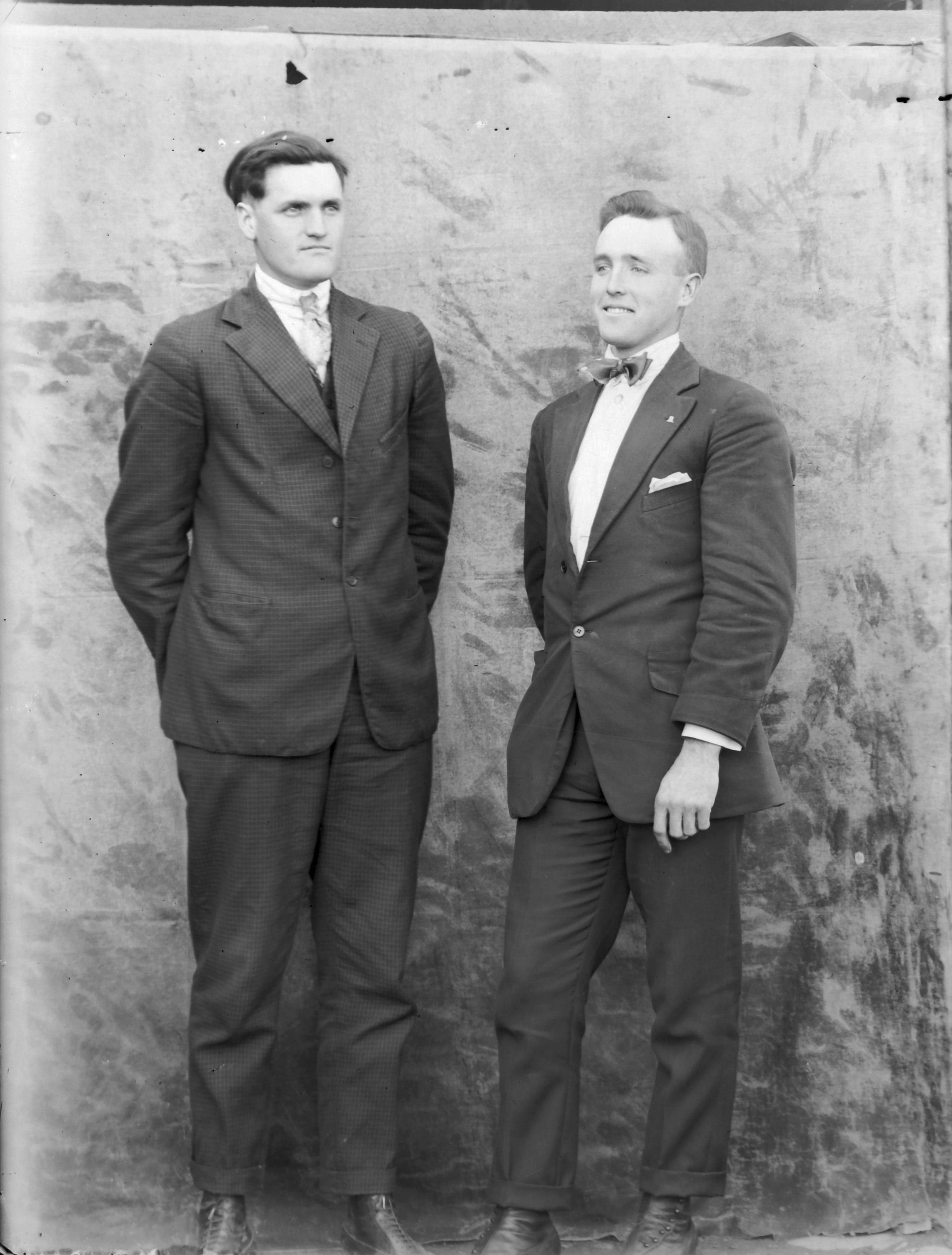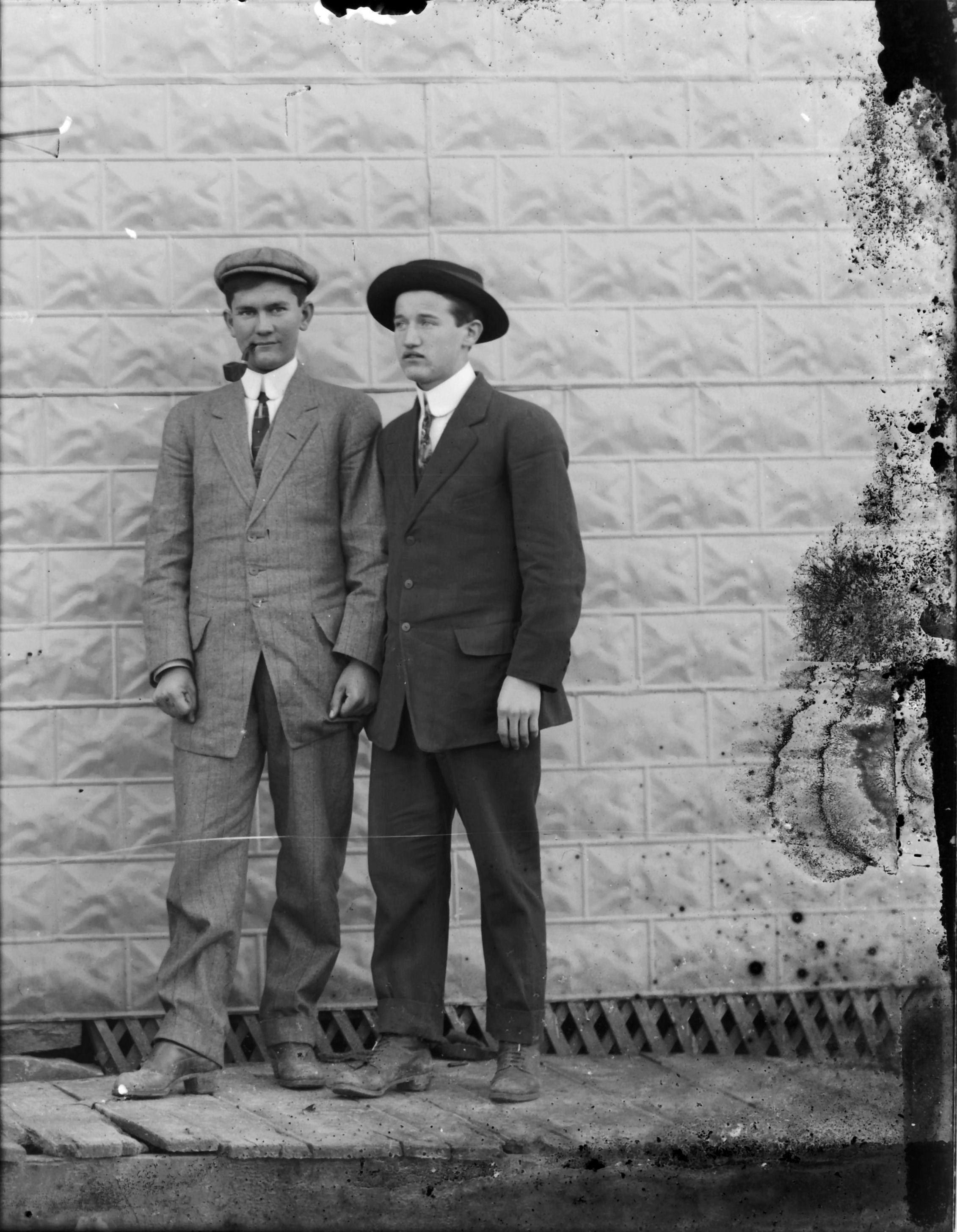 2 males, one smoking a pipe next to bldg