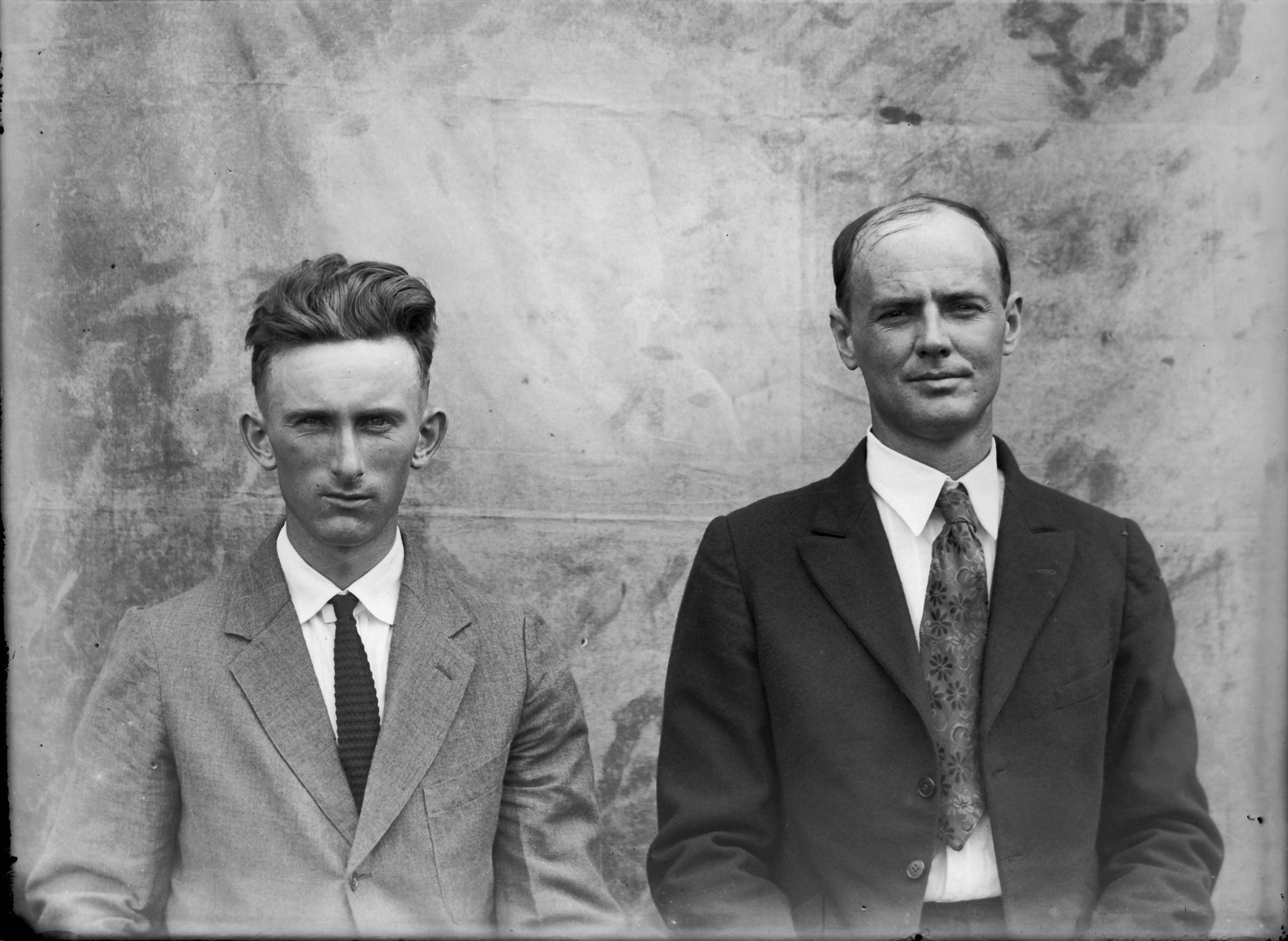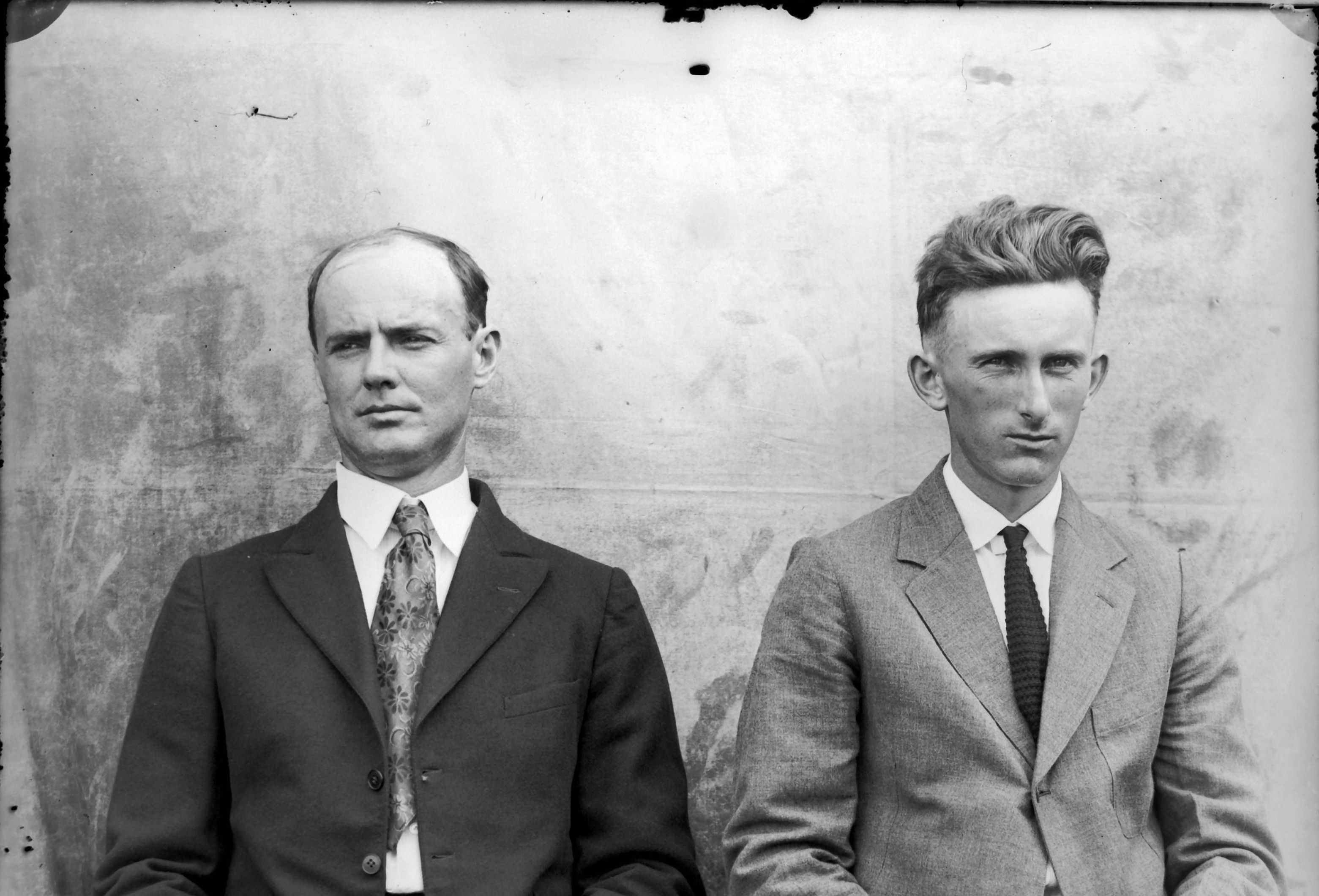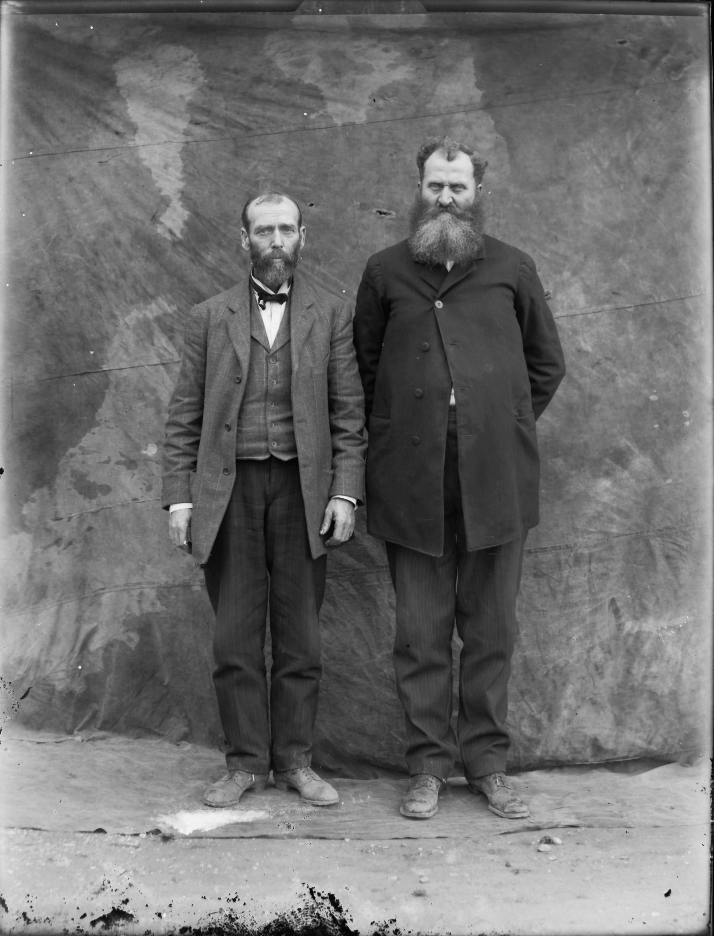 2 older, bearded males next to bldg