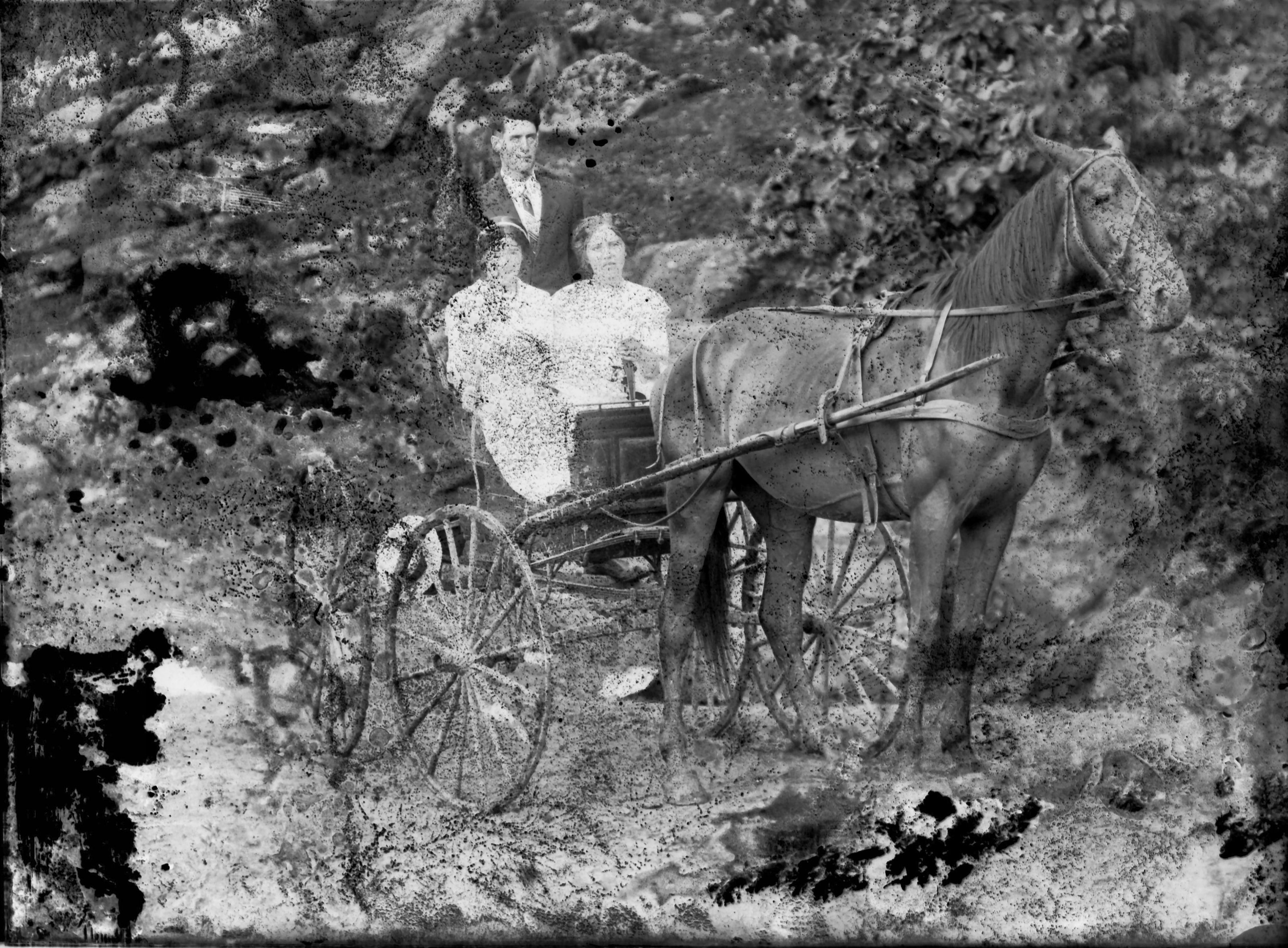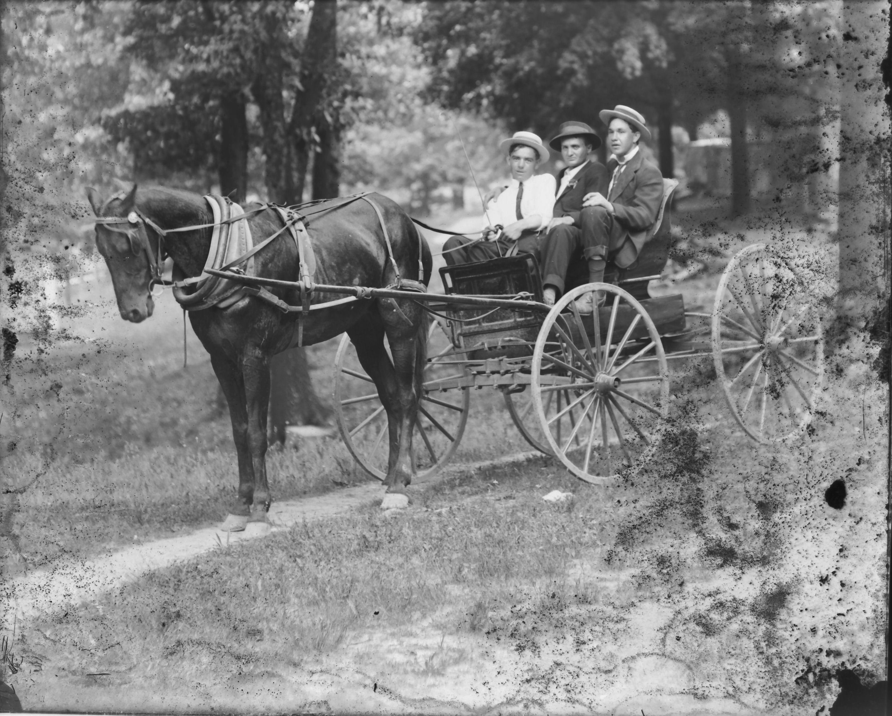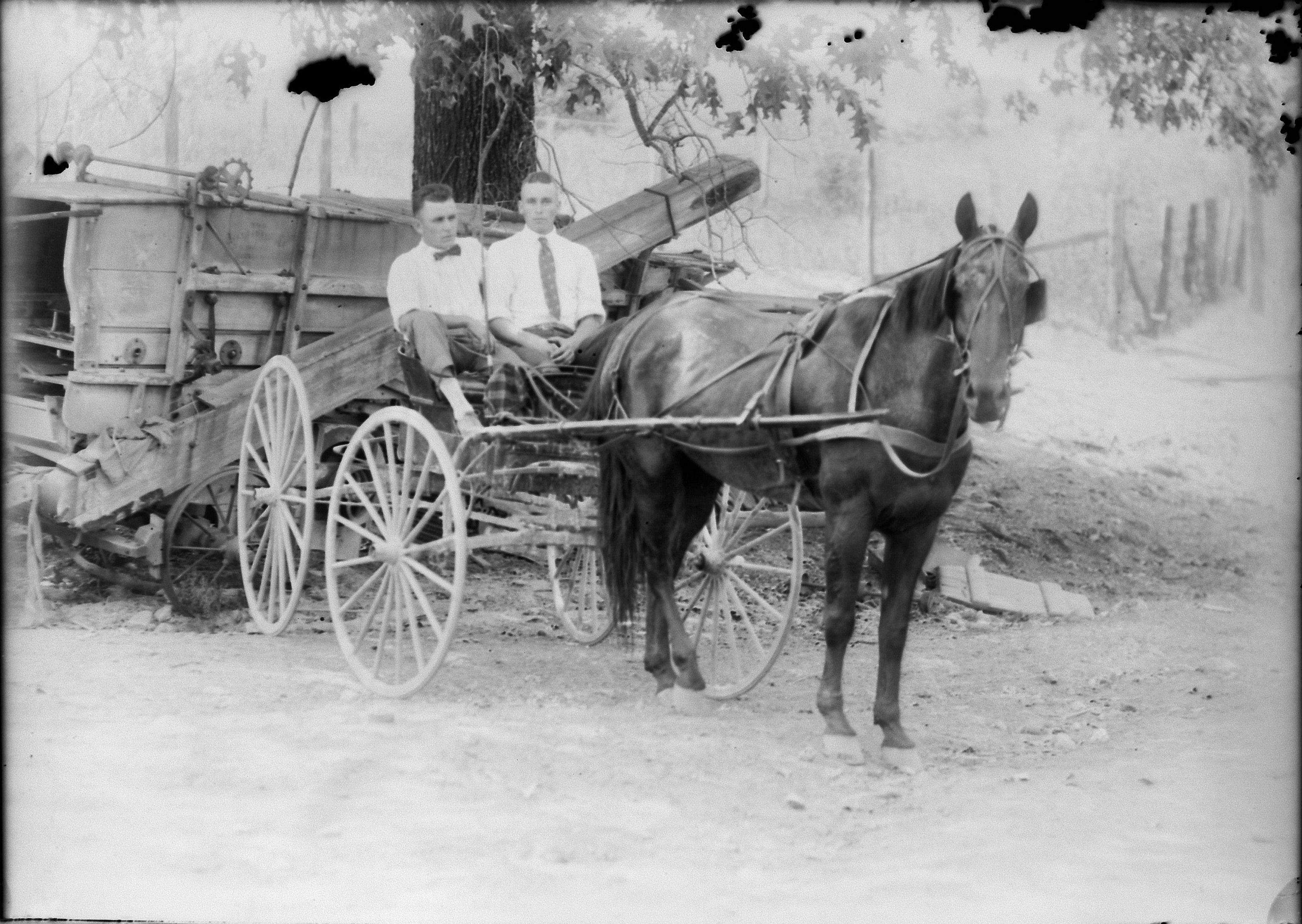 2 males in horse drawn buggy