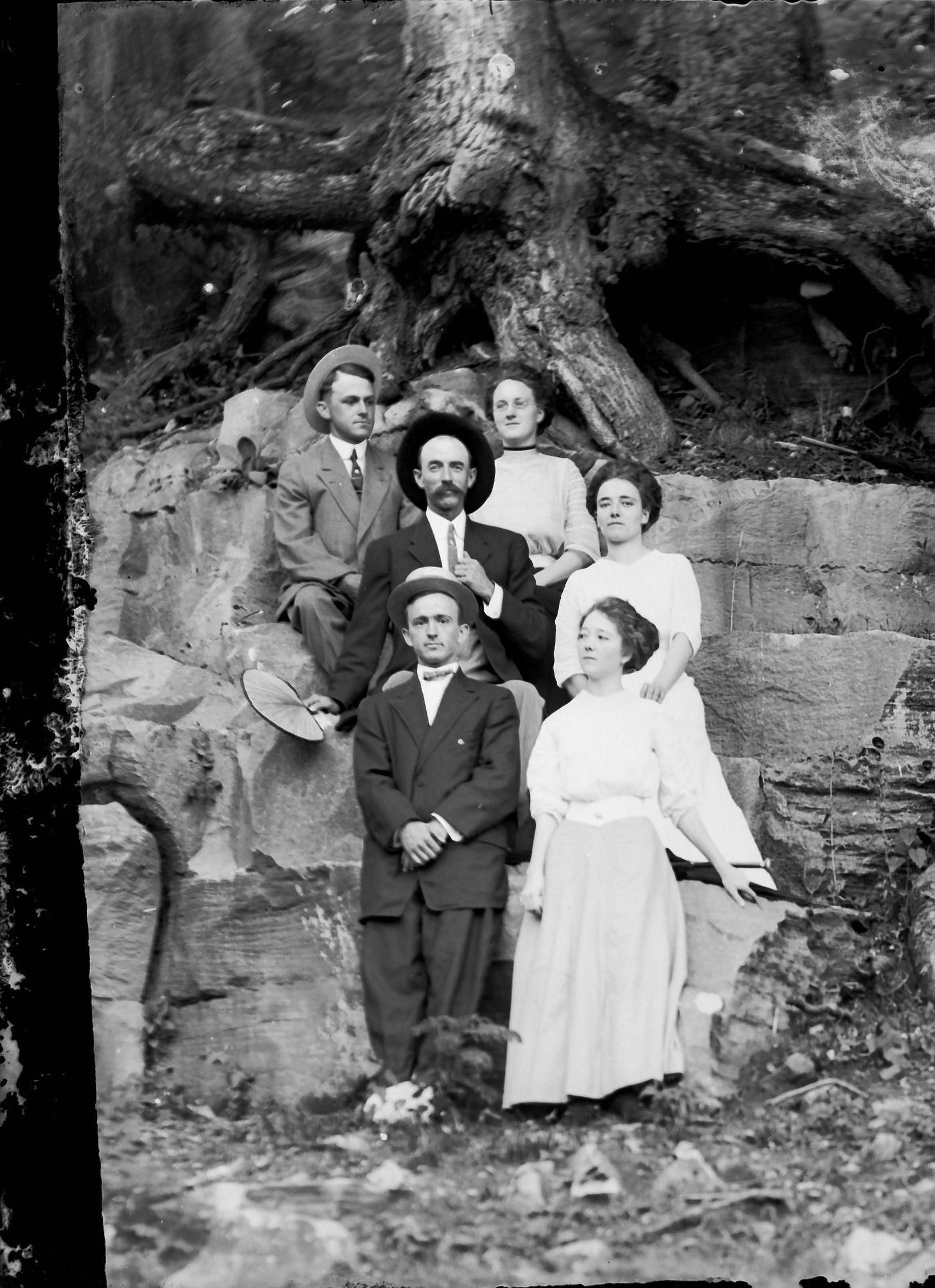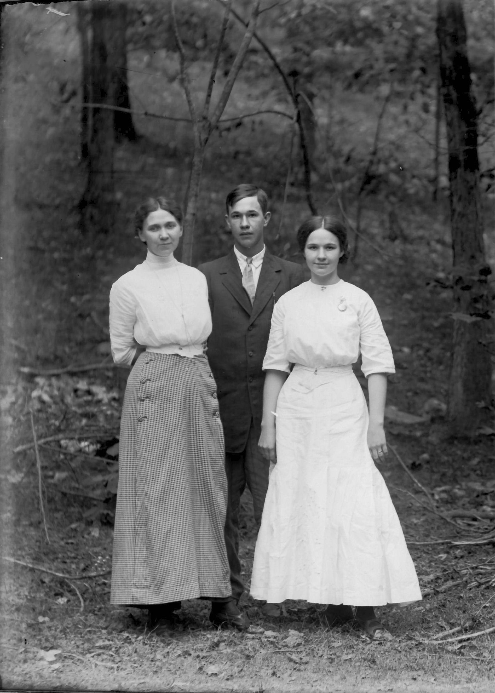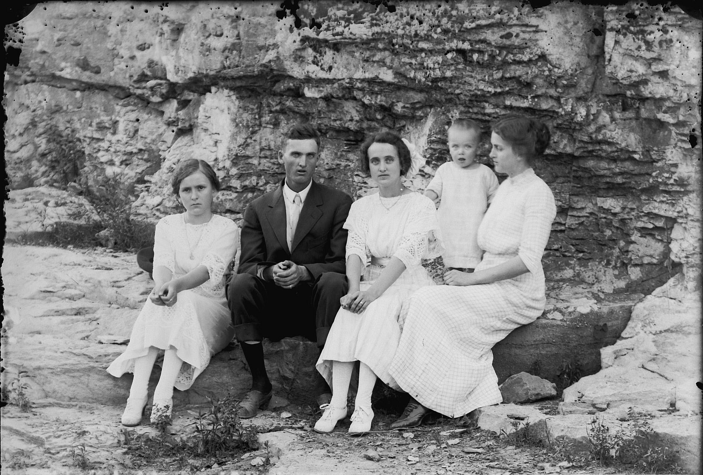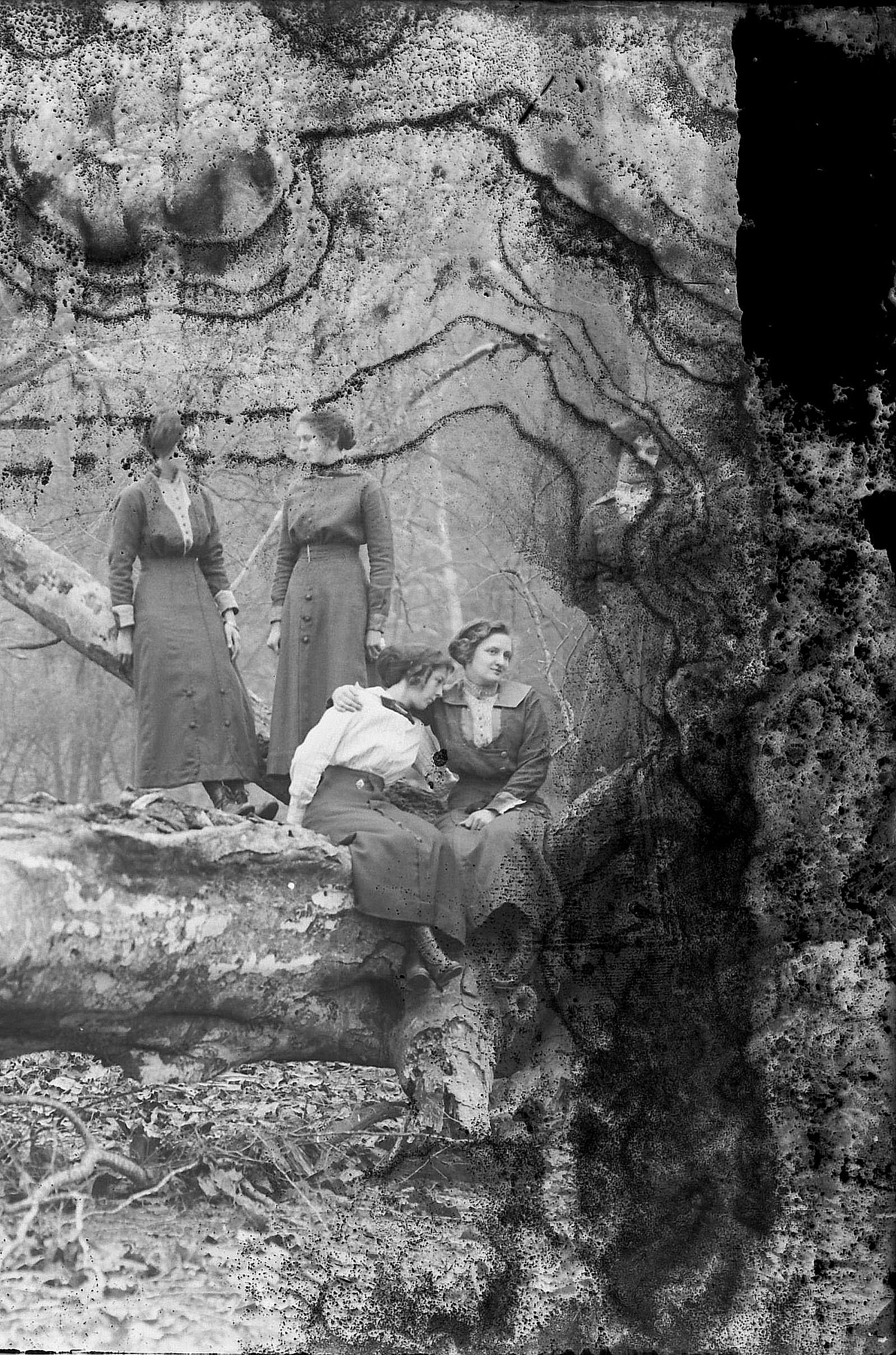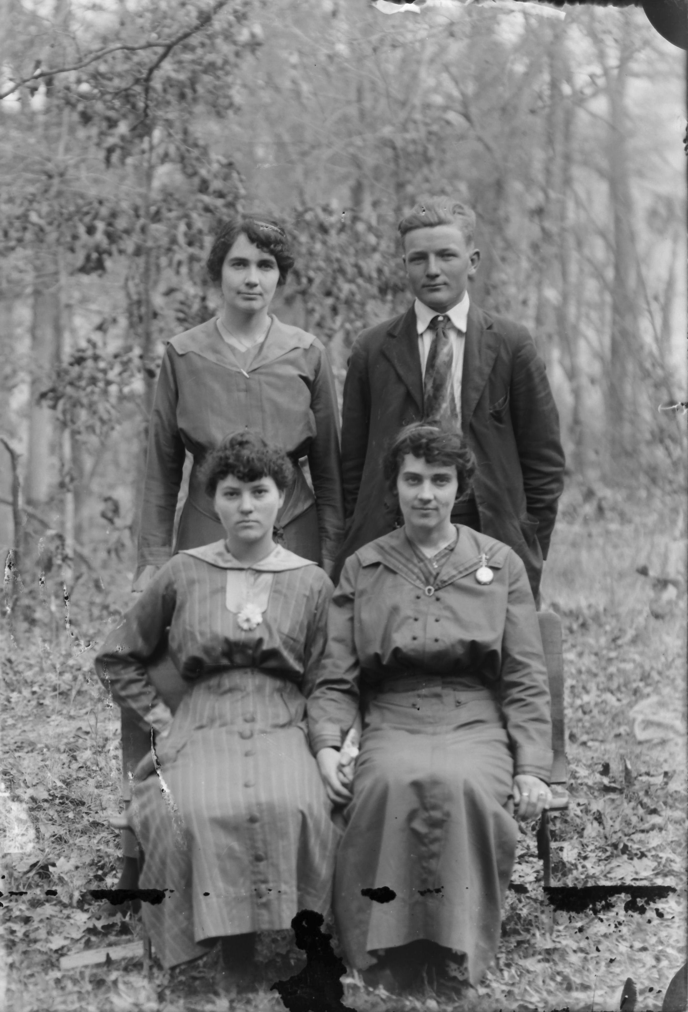 front row Nannie Earl (Morgan) Vick, male, Maggie (Clinard) Milton, Herbert Ervin Milton Sr in woods