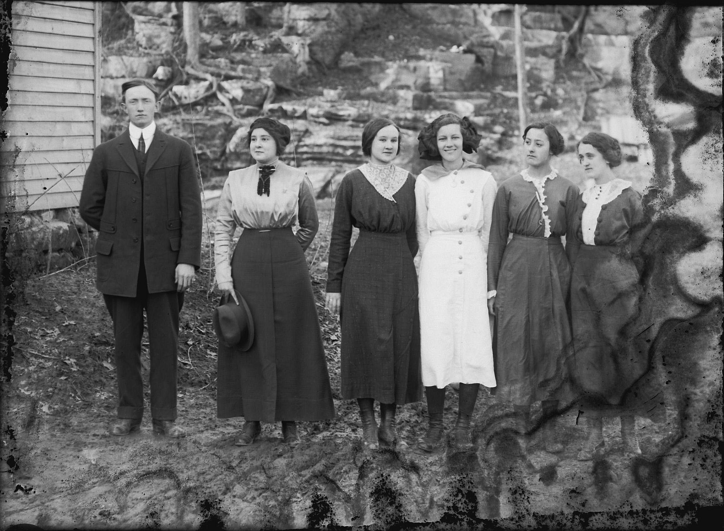 female, Louie Keeney, female, male, female, female, female, Velma Miles Hicks by log bldg