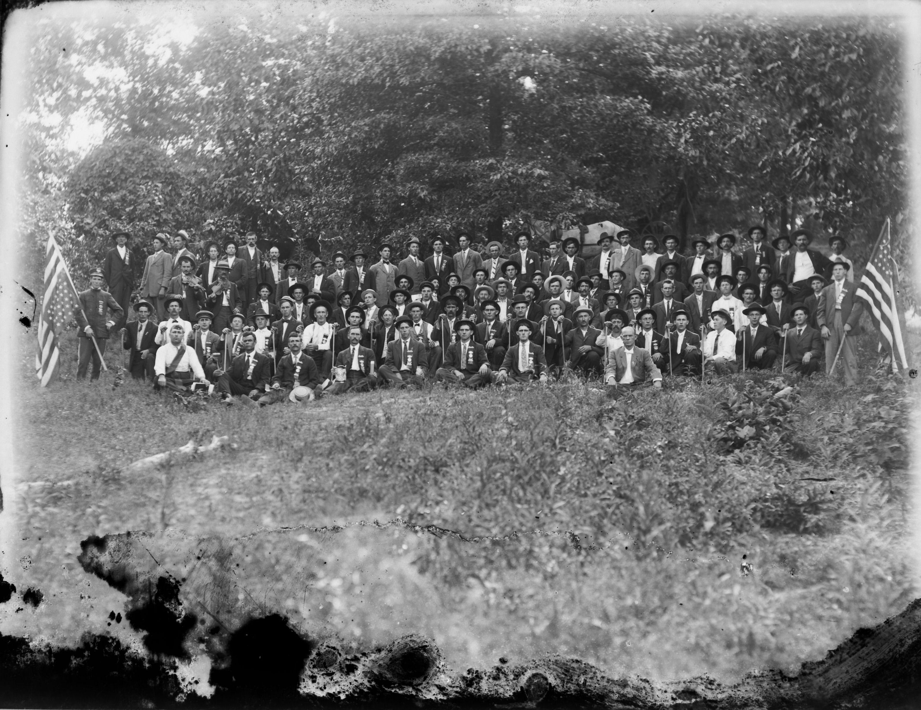 large Woodmen of the World group in field, Mabin N Miles playing left handed fiddle on left side