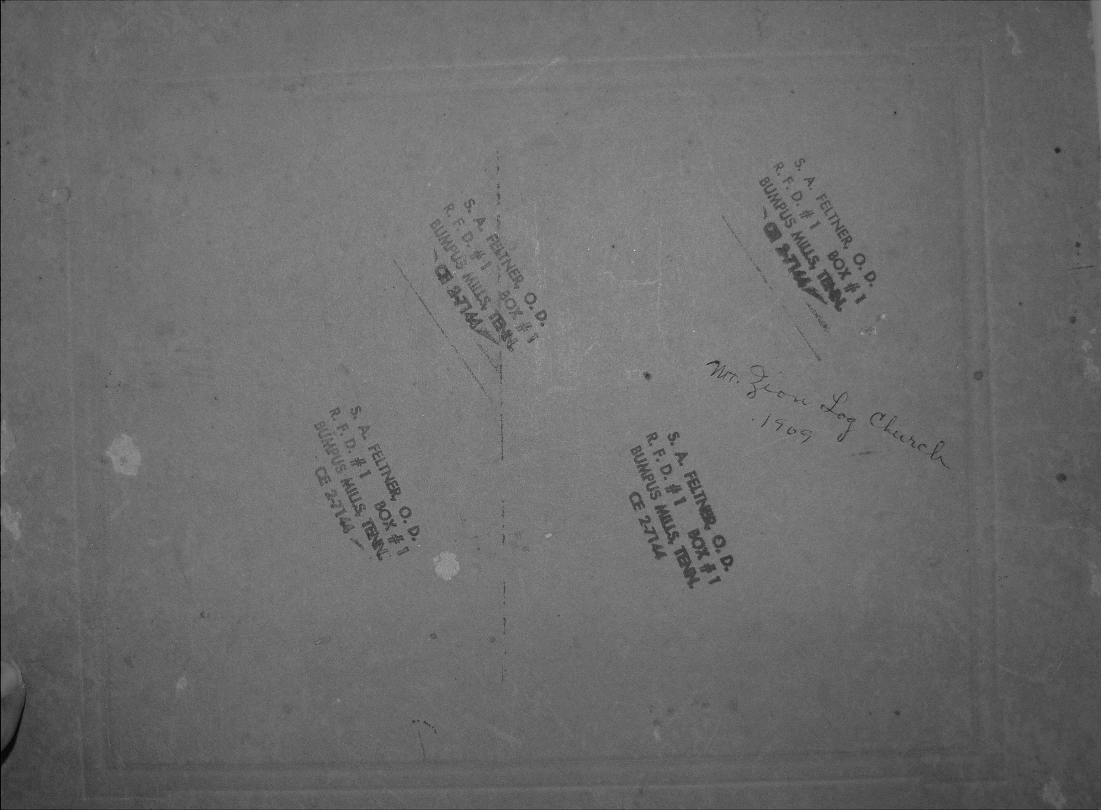 inscription Mt Zion Log Church, 1909