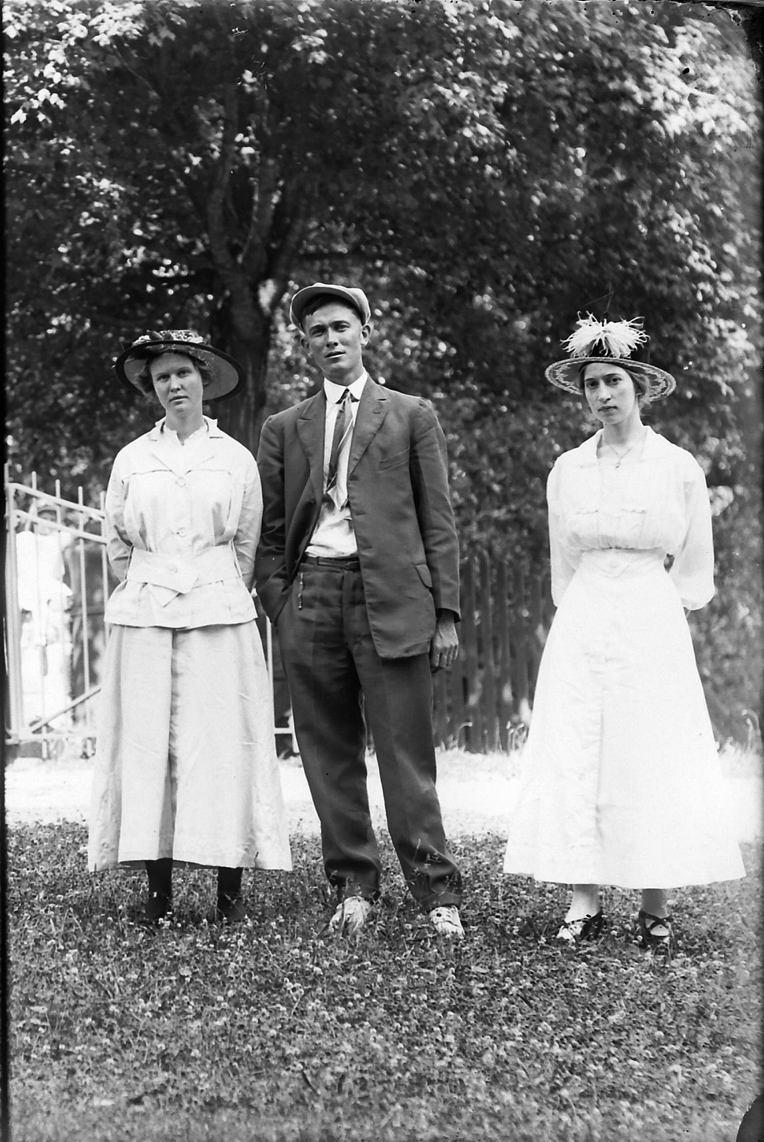 1 male, 2 females in front of pine tree
