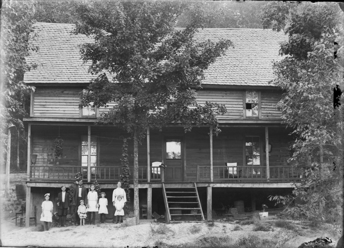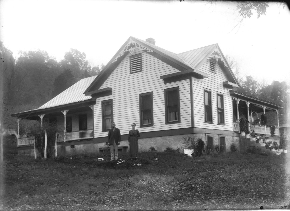 new house with family on porch, middle Amanda Feltner?, right side Sam Jr, Mary C & Mamie Jarman Feltner