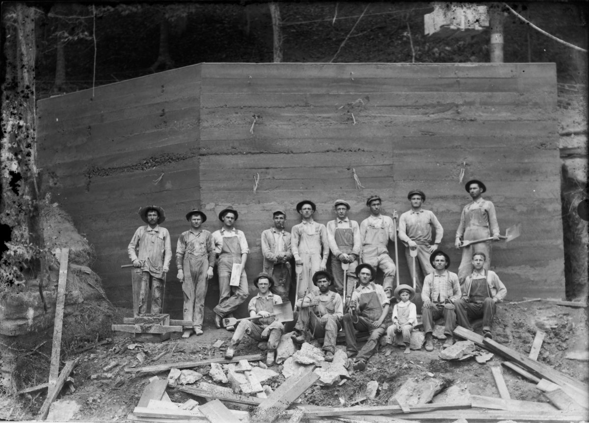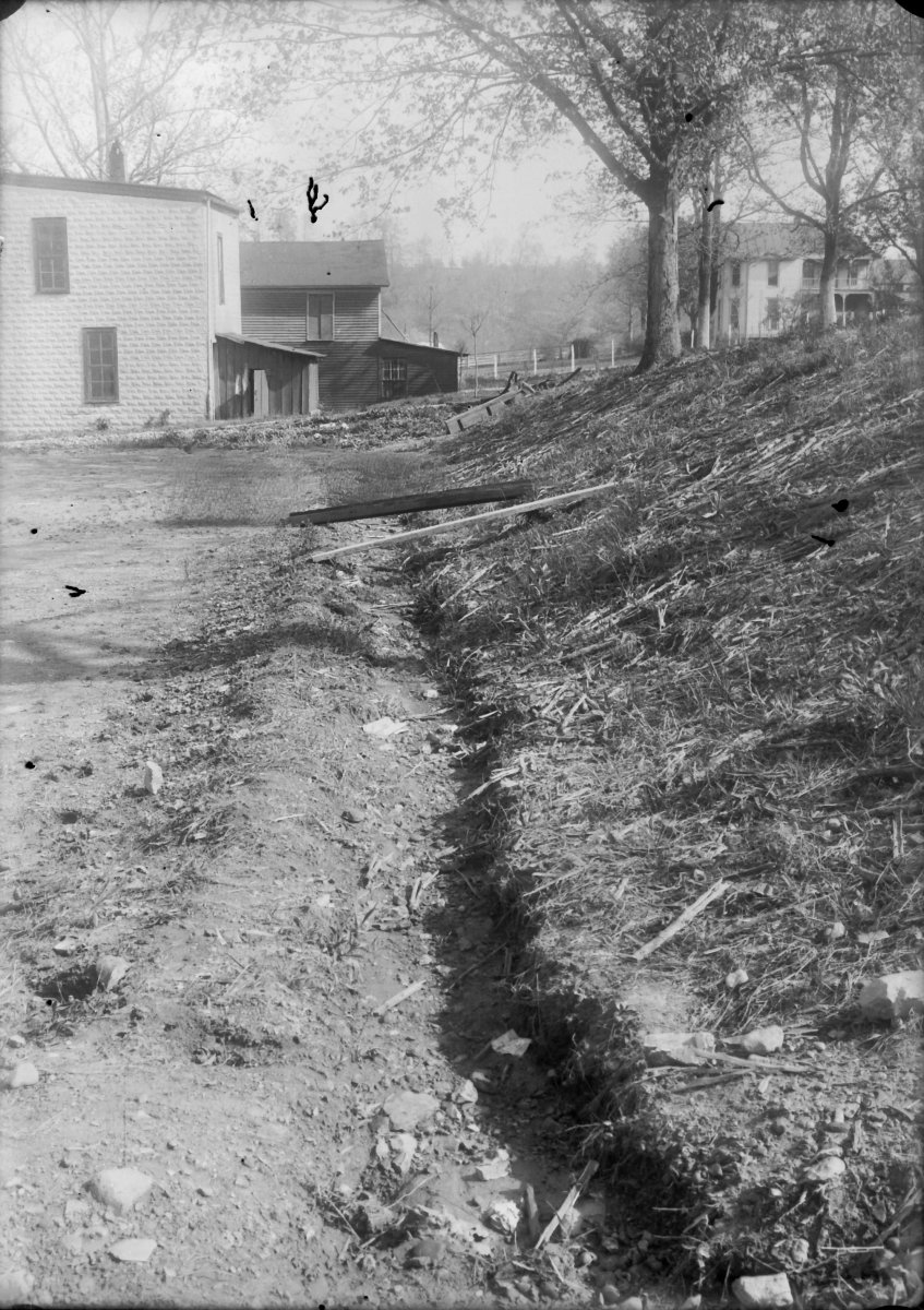 excavation behind buildings in Bumpus Mills. Possibly the Flavius Clark house behind the bank building. The Clark house was Lois Clark Wallace’s family home
