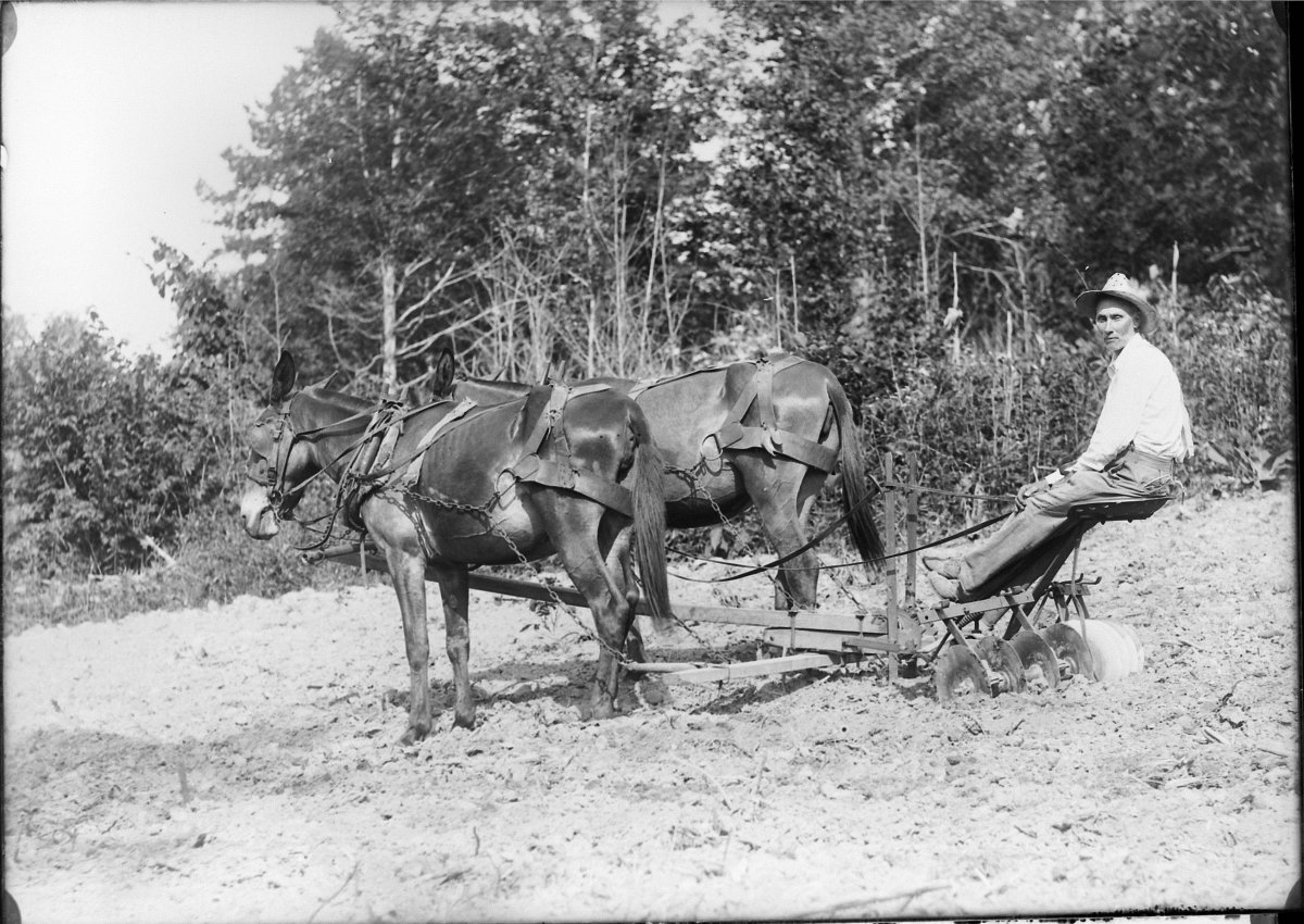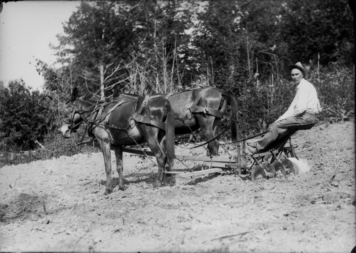 Jeff William Page on a mule drawn cultivator, see M km-53
