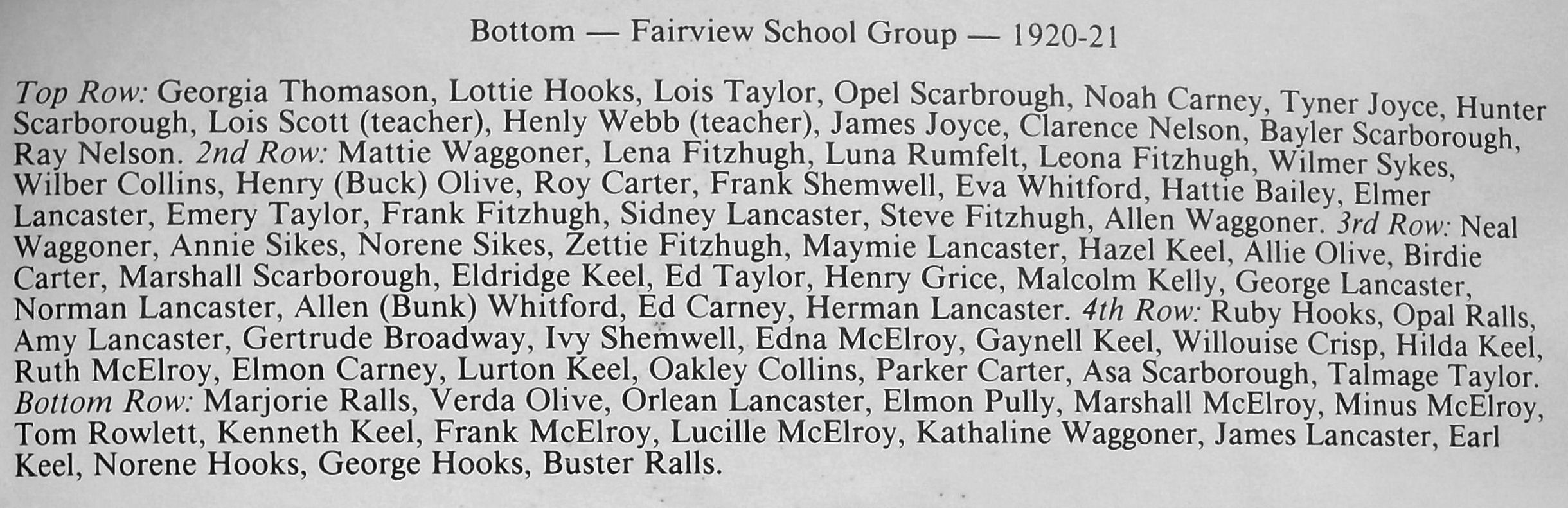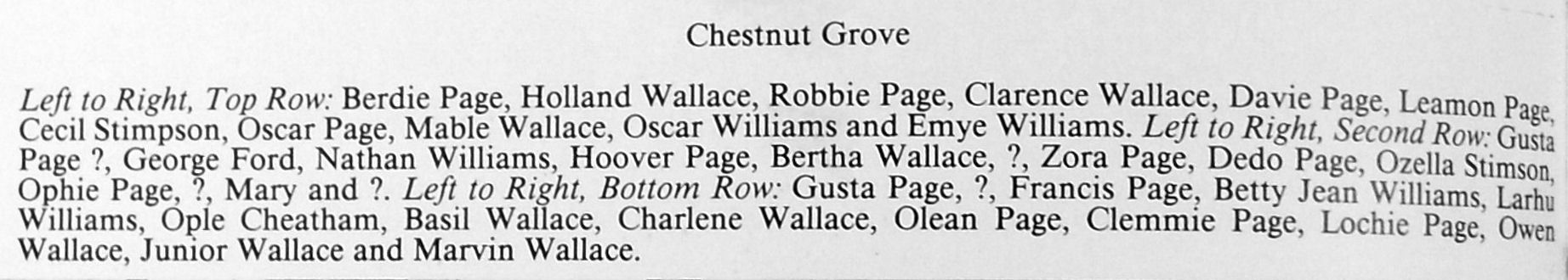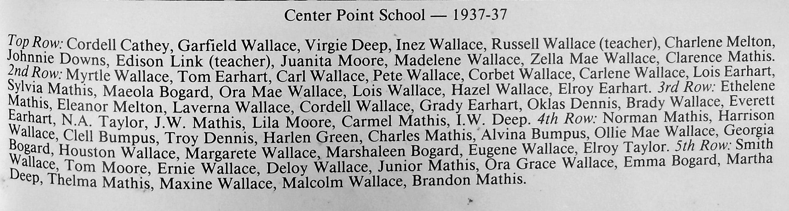 3rd row: Orvie Wallace, Marvie Page, Carlene Bogard, Lovie Bogard, Arnella Lee, ____ Page, Lolita Wallace, Marie Mathis, Arzella Jackson, Comer Taylor, Roy Jackson, Humes Wallace, Evans Page, Roy Cheatham, Paul Link, Grady Melton, Lloyd Page, Robert Cheatham