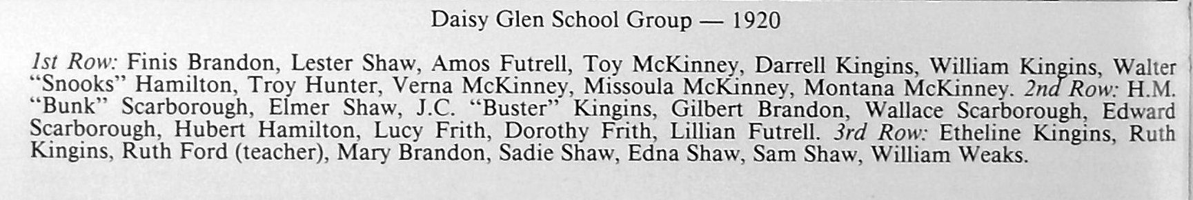 3rd row – Willie Francis, Rogers Carr, Ewing Shemwell, Irving Shemwell, Alec Dunn, Earl Francis, Lizzie Walker, Mary Dunn, Rosie Sowell, Etheline Walker, Dessie McCain, Nancy Walker, Lexie Walker, Gustie Walker, Myrtle Joiner, Birdie Francis