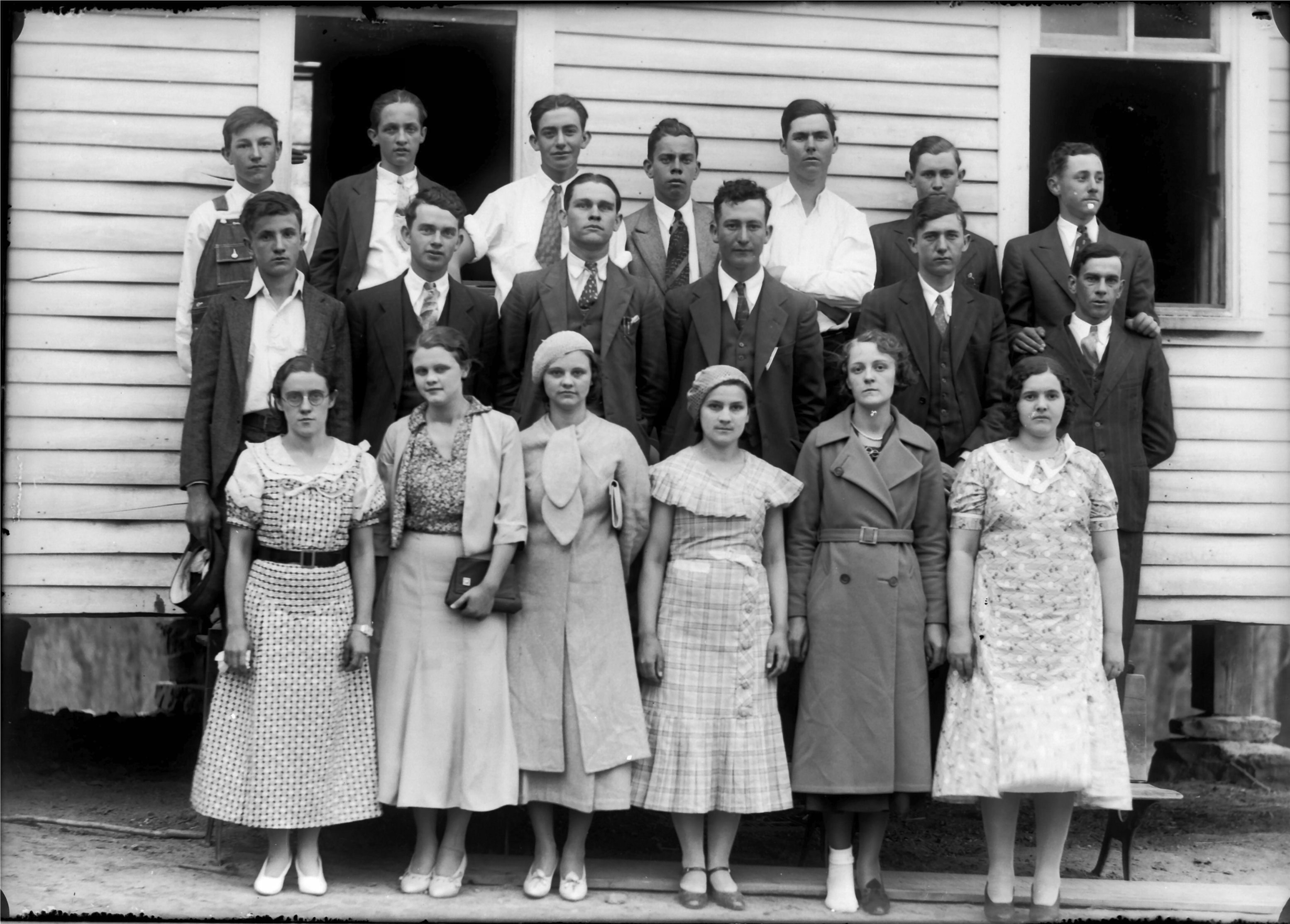 bottom row: Hettie Bogard, James Bogard, ?, Ethel Newberry, Magdalene Taylor, Vivian Page, ?, ____ Link, Noreen Melton, Mavis Cheatham, Margaret Taylor, Cecil Stimson, Cloyce Wallace, Erskin Link, Arnold Taylor, Zeb Page