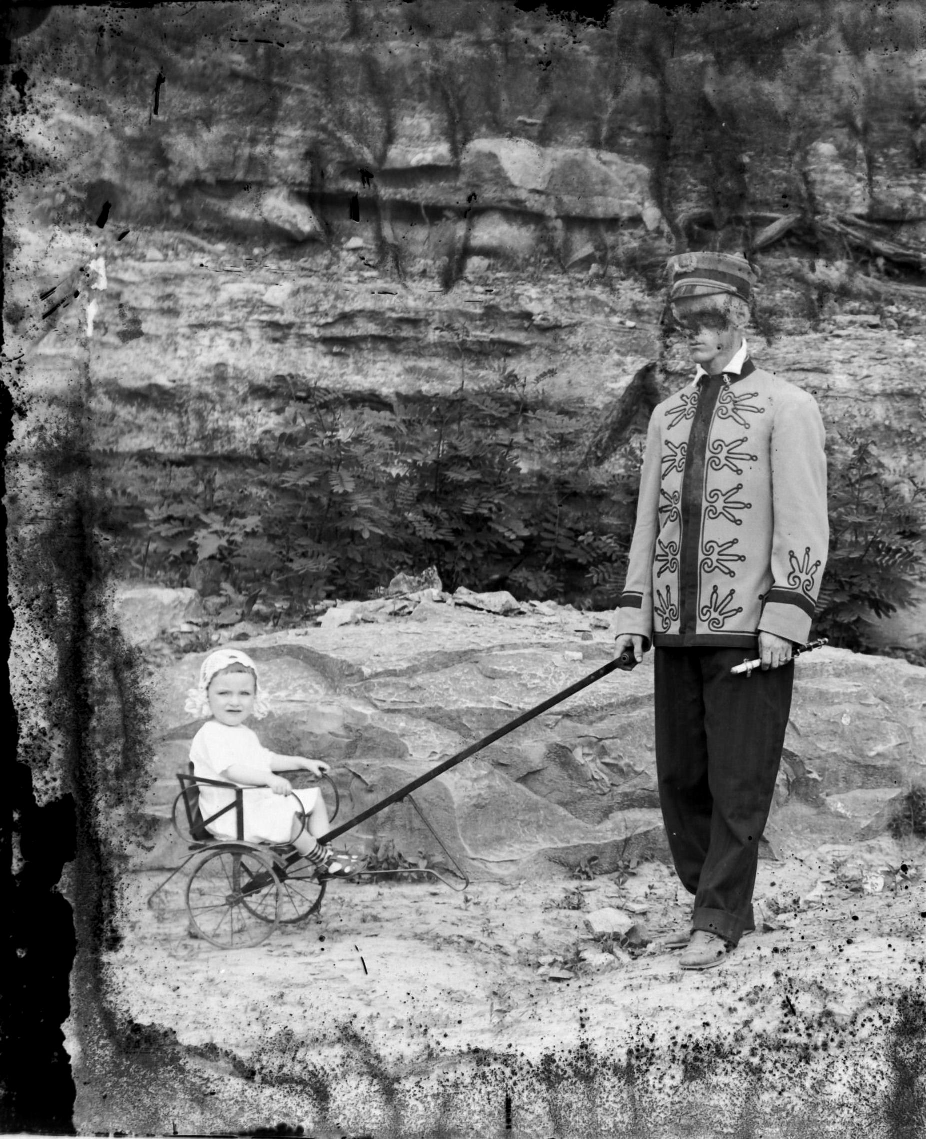 Elmer Holland, piccolo player with child in stroller, Big Rock