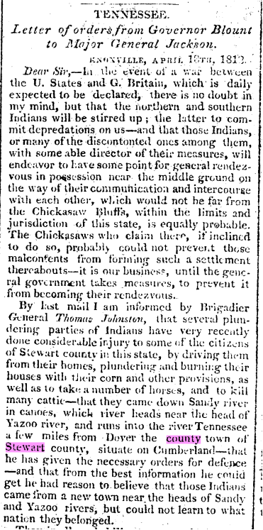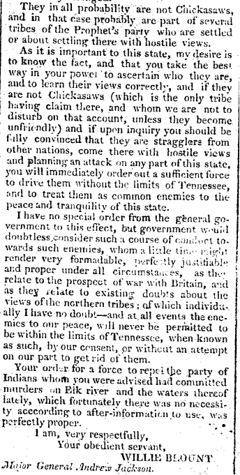 National Intelligencer, (Washington, DC) Tuesday, May 19, 1812; Issue 1811; col D Tennessee Letter of Orders from Governor Blount to Major General Jackson Willie Blount Major General Andrew Jackson.