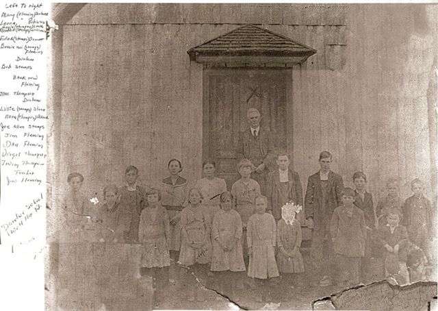 Back row: ______Fleming, Mac Thompson, ________Durham, Lillie Stamps Sloan, O'Nora Thompson Adcock, Joe Allen Stamps, Jim Fleming, Dan Fleming, Virgil Thompson, Irving Thompson. Teacher: J.W. Fleming