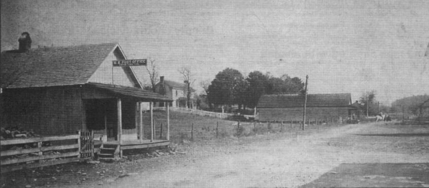 This is a photograph of Cottontown taken on Red River Road (Highway 25) in the 1920s. It shows the original Cottontown post office and in the background, the David A. Rascoe house can be seen. It was built by Rascoe in 1877 and still stands today.