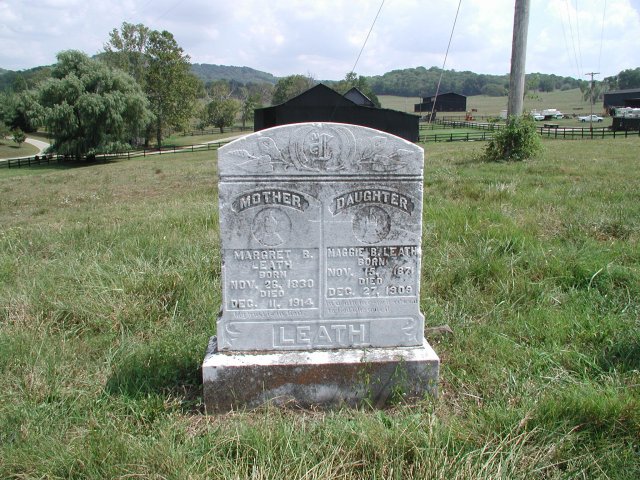 Leath, Frank 1849 - 1885 Leath, W.M. 22 Aug 1825 - 13 Jan 1899 Leath, Margret B. 26 Nov 1830 - 11 Dec 1914 Mother Leath, Maggie B. 15 Nov 1871 - 27 Dec 1909 Daughter Leath, John W. 12 Mar 1863 - 5 July 1933 Copied by Retta Waggoner Aug 2002.