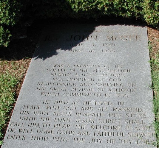 REV. JOHN MCGEE JUNE 9, 1763 JUNE 16, 1836 WAS A PREACHER OF THE GOSPEL IN THE M. E. CHURCH NEARLY HALF A CENTURY. WAS HONORED OF GOD IN THE BEGINNING AND CARRYING ON THE GREAT REVIVAL OF RELIGON WHICH WAS COMMENCED IN 1799. HE DIED AS HE LIVED, IN PEACE WITH GOD AND ALL MANKIND. HIS BODY RESTS BENEATH THIS STONE, UNTIL THE LORD JESUS CHRIST SHALL CALL HIM, TO HEAR THE WELCOME PLAUDIT OF, WELL DONE, GOOD AND FAITHFUL SERVANT. ENTER THOU INTO THE JOY OF THY LORD. |