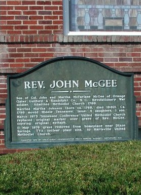 Married Martha Johnson (born ca. 1760, died 1840). Ca. 1798 moved Middle Tennessee. Issue: 4 daughters, 1 son. March 1973 Tennessee Conference United Methodist Church replaced original marker over grave of Rev. McGee, copying original epitaph. 11 May 1976 grave removed from homeplace near Dixon Springs, TVA nuclear plant site, to Hartsville United Methodist Church. Presented 1976 by great, great granddaughter Helen Bowling McKnight, Huntsville, Ala.