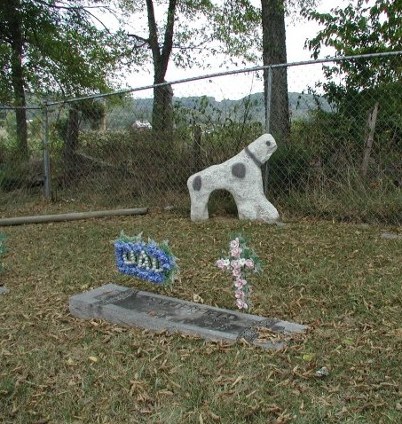 ![]() The stone shaped like a dog was found by Bill Satterfield, who painted it and placed in the yard of his home. After his death in 1952 it was moved to the cemetery to mark his grave. When his wife Annie died in 1982 a permanent marker was placed. |