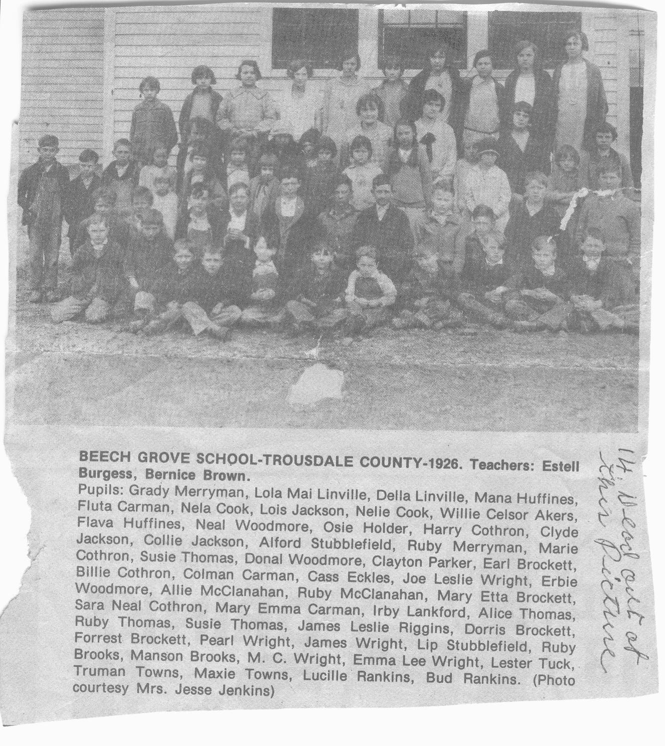 Pupils: Grady Merryman, Lola Mai Linville, Della Linville, Mana Huffines, Fluta Carman, Nela Cook, Lois Jackson, Nelie Cook, Willie Celsor Akers, Flava Huffines, Neal Woodmoore, Osie Holder, Harry Cothron, Clyde Jackson, Collie Jackson, Alford Stubblefield, Ruby Merryman, Marie Cothron, susie Thomas, Donal Woodmore, Clayton Parker, Earl Brockett, Billie Cothron, Colman Carman, Cass Eckles, Joe Leslie Wright, Erbie Woodmore, Allie McClanahan, Ruby McClanahan, Mary Etta Brockett, Sara Neal Cothron, Mary Emma Carman,Irby Lankford, Alice Thomas, Ruby Thomas, Susie Thomas, James Lellie Riggins, Dorris Brockett, Forrest Brockett, Pearl Wright, James Wright, Lip Stubblefield, Ruby Brooks, Manson Brooks, M.C. Wright, Emma Lee Wright, Lester Tuck, Truman Towns, Maxie Towns, Lucille Rankins, Bud Rankins. |