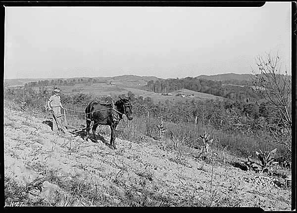 Boy plowing potato field with a mule and bull-tongue plow on steep slope on J. W. Melton farm on Andersonville, Tennessee, road. This farm is on the edge of the area to be flooded by the Norris Dam reservoir. 10/24/1933