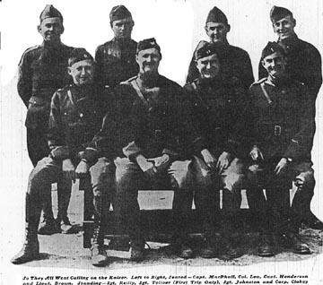 They are, from Left to Right, seated: Capt. MacPhail, Col. Lea, Capt. Henderson and Lieut. Brown. Standing: Sgt. Reilly, Sgt. Toliver, Sgt. Johnston, and Corp. Clokey.